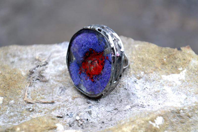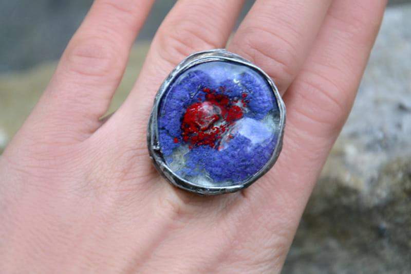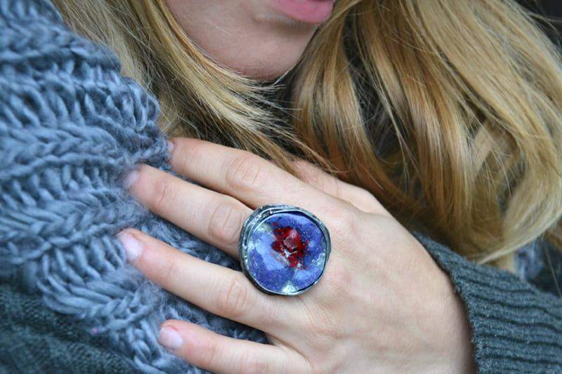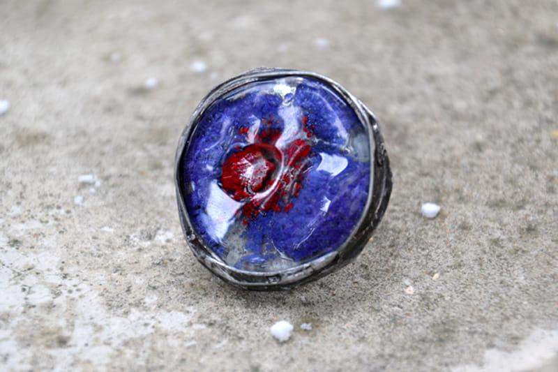 Intrygujący pierścionek z wytopionym przeze mnie szkiełkiem. Szkiełko o średnicy ok. 3 cm oprawione w cynę stylizowaną na stare srebro. Obrączka regulowana. Biżuteria w 100% wykonana ręcznie, poszczególne sztuki mogą się minimalnie różnić.