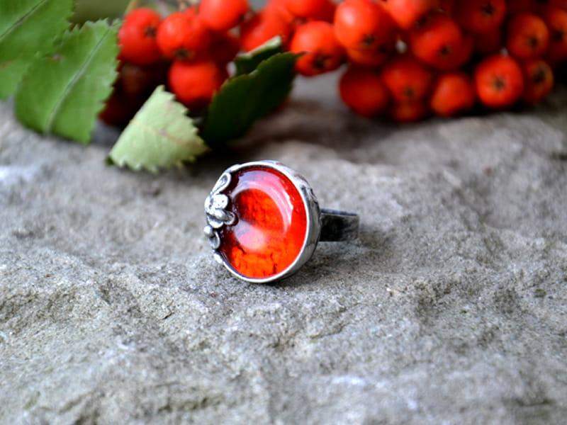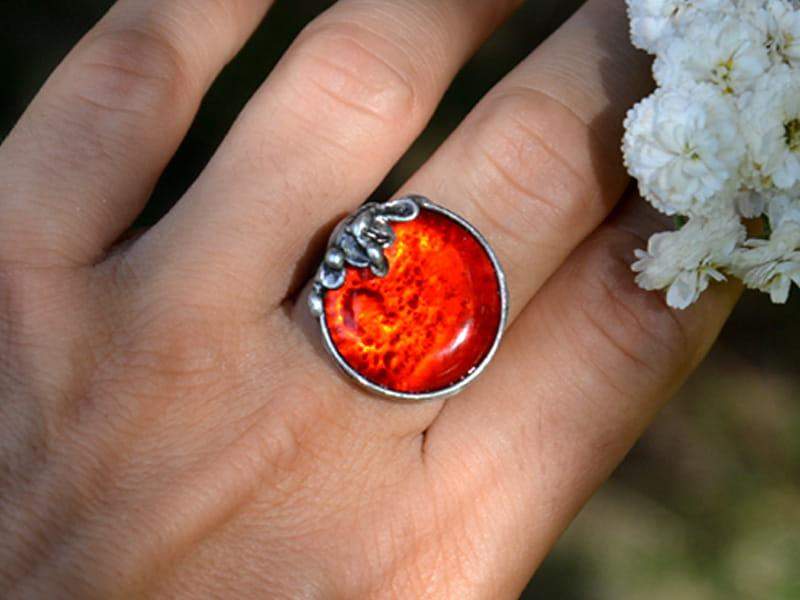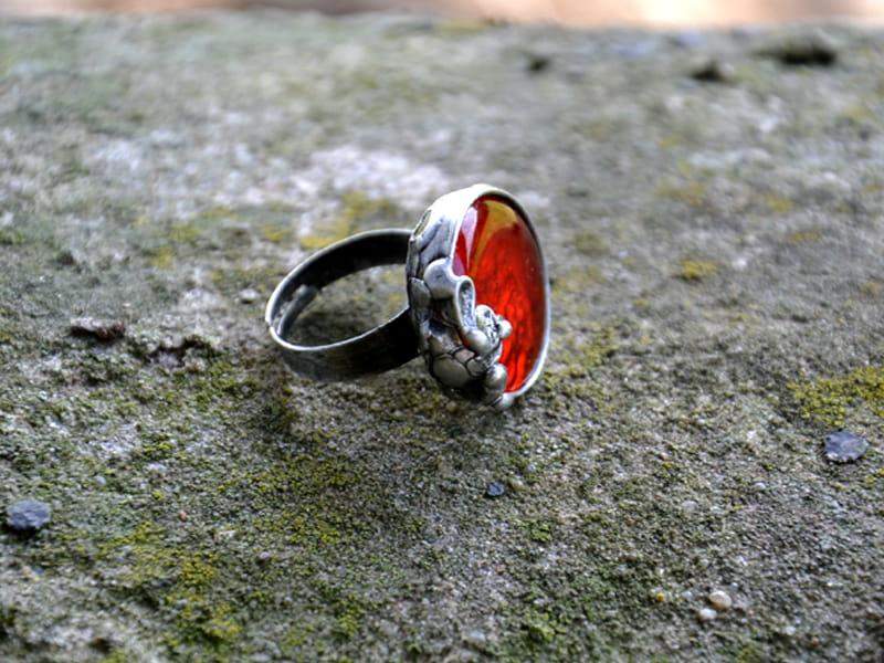 Efektowny pierścionek ze stapianym szkłem w pięknym kolorze. Średnica szkła wraz ze stylizowaną na stare srebro oprawą to ok. 2 cm. Obrączka regulowana.