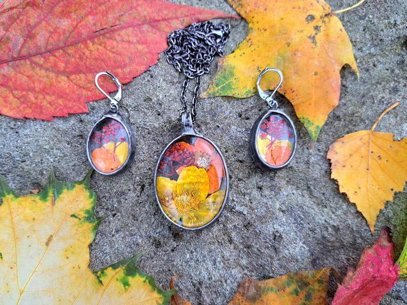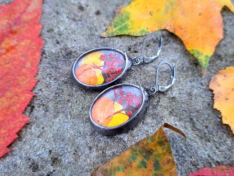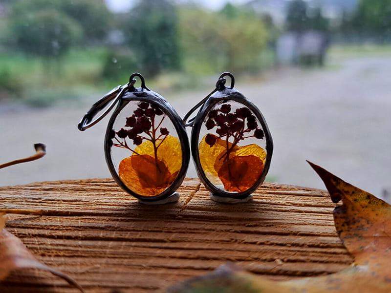 Jesienne kolczyki z kwiatami zamkniętymi w szkle.