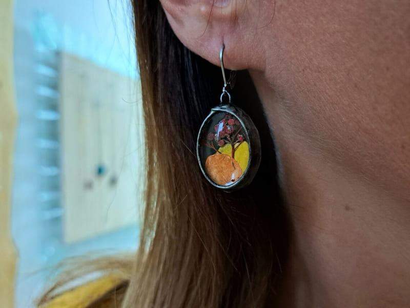 Jesienne kolczyki z kwiatami zamkniętymi w owalnych, wypukłych szkiełkach. Kolczyki inspirowane są barwami jesieni.