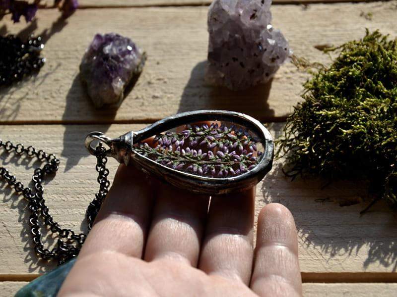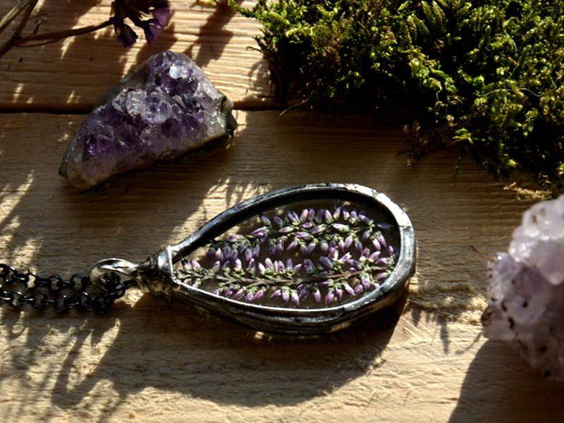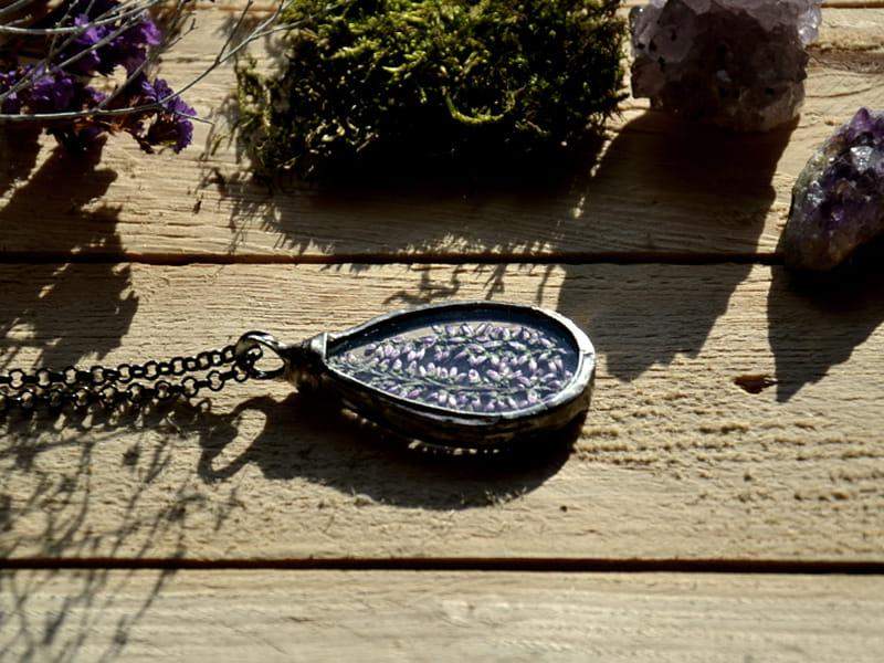 Wisior z zamkniętym w szkle wrzosem. Zawieszony na długim łańcuszku. Całość stylizowana na stare srebro. Wymiary zawieszki ok 3,5 x 5,5 cm. Biżuteria wykonana ręcznie, poszczególne egzemplarze mogą nieznacznie się między sobą różnić.