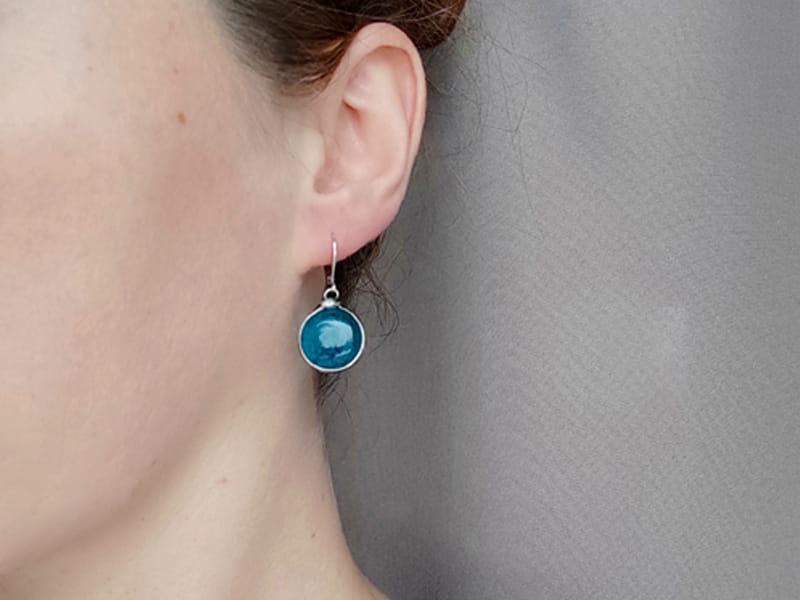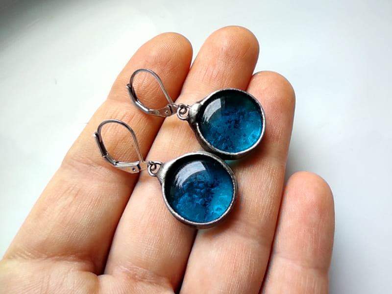 Rustykalne, lekkie kolczyki z turkusowym szkłem. Oprawa i antyalergiczne bigle w kolorze ciemnego srebra. Długość kolczyka to ok. 3,5 cm. Biżuteria w 100% wykonana ręcznie, poszczególne sztuki mogą się minimalnie różnić.