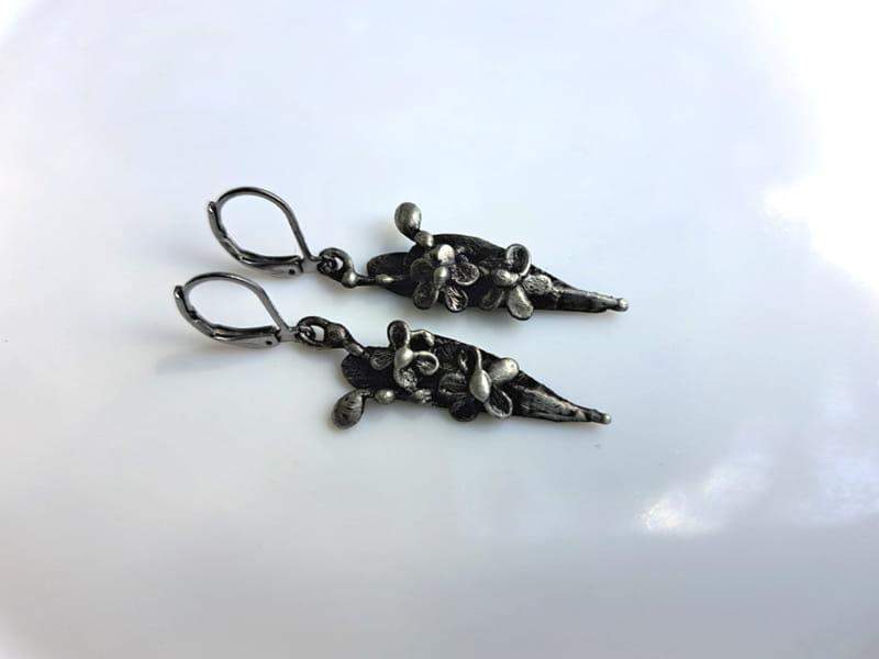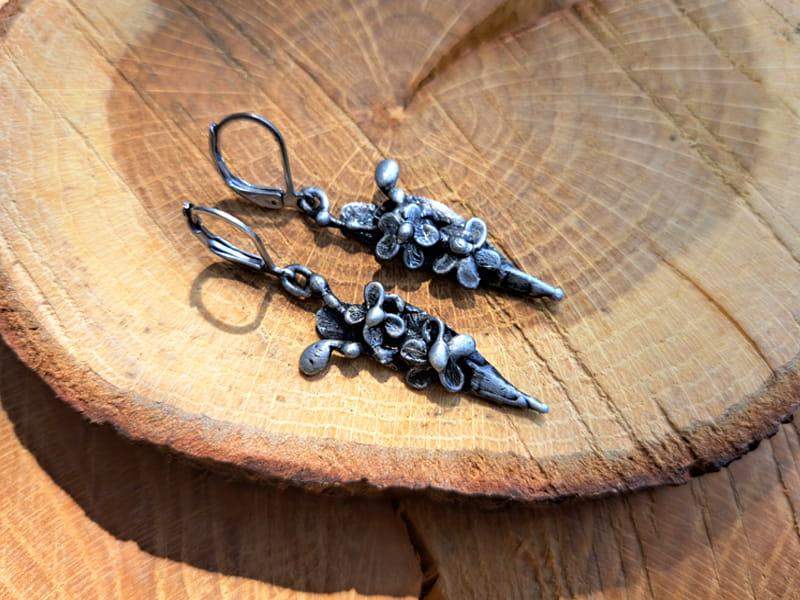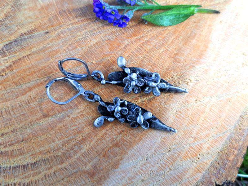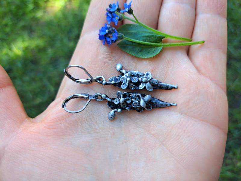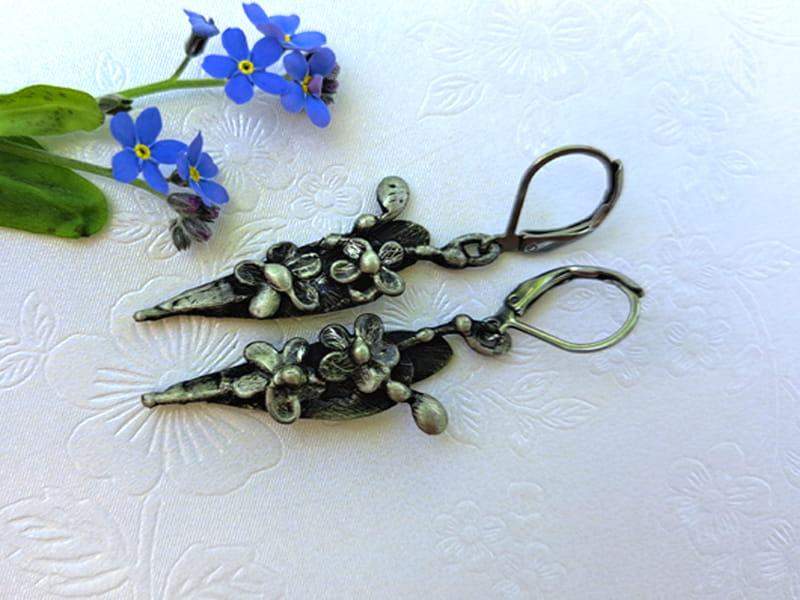 Lekkie, wiszące kolczyki w kształcie gałązki niezapominajek. Kolczyki wykonane techniką metaloplastyki.