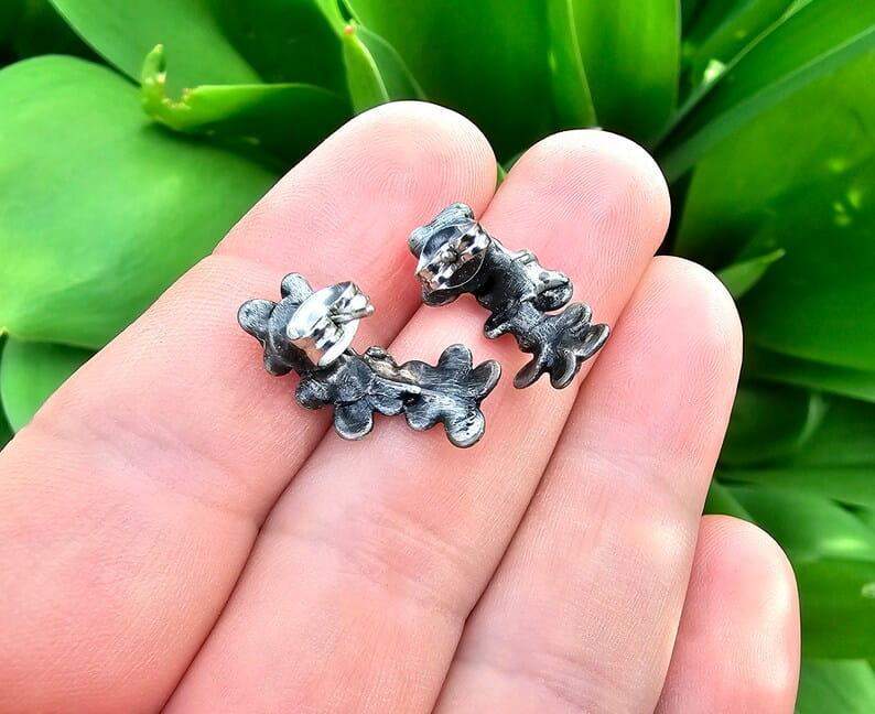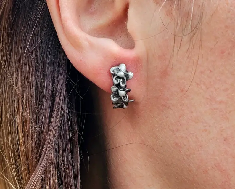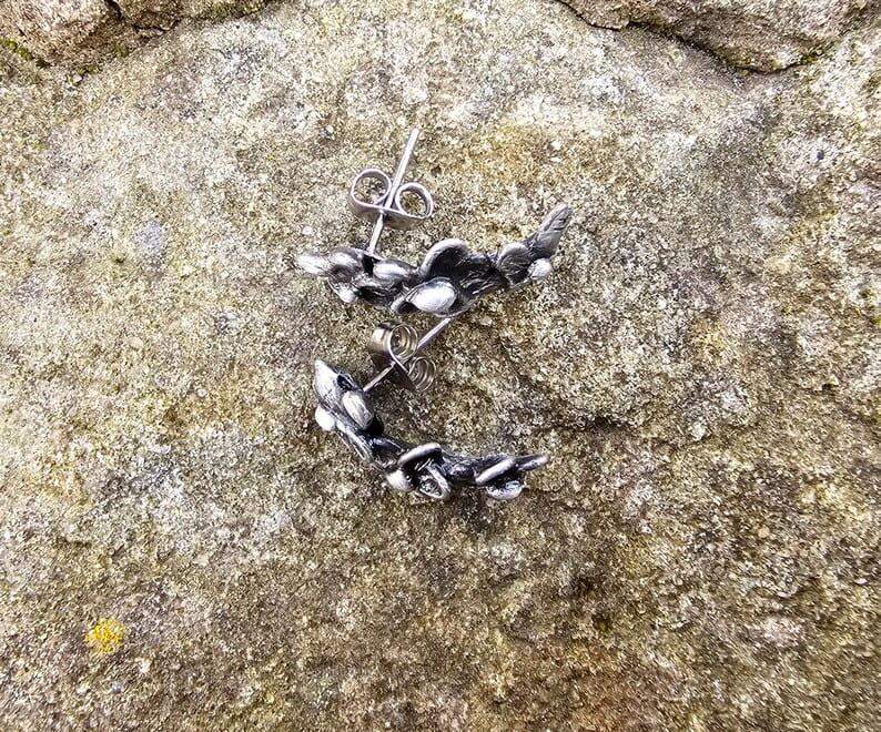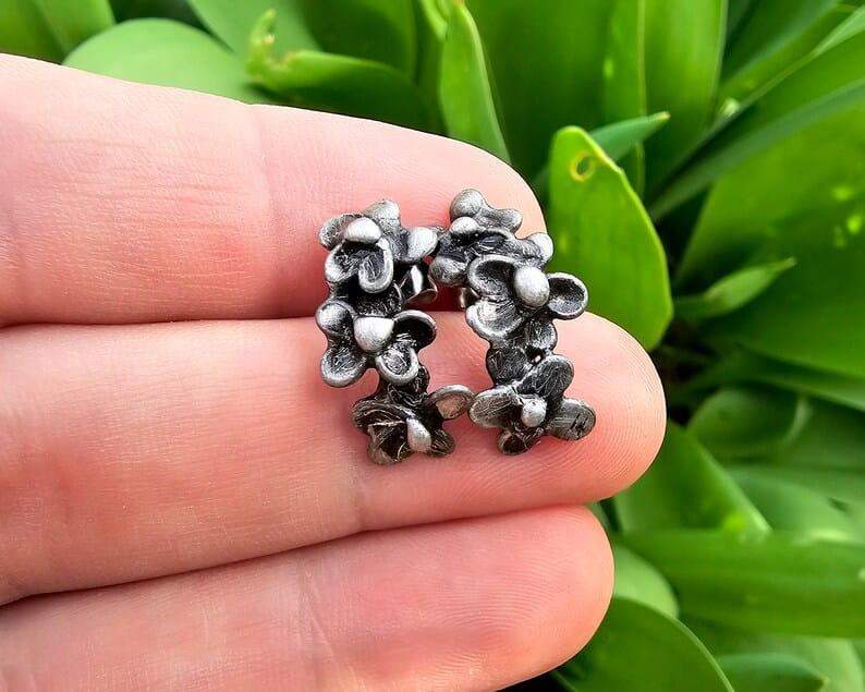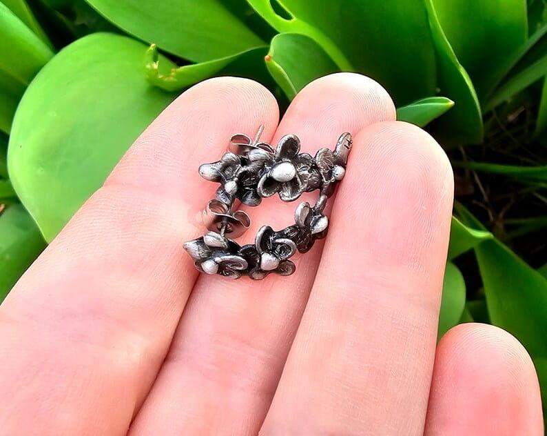 Lekkie, wiszące kolczyki w kształcie gałązki niezapominajek. Kolczyki wykonane techniką metaloplastyki.