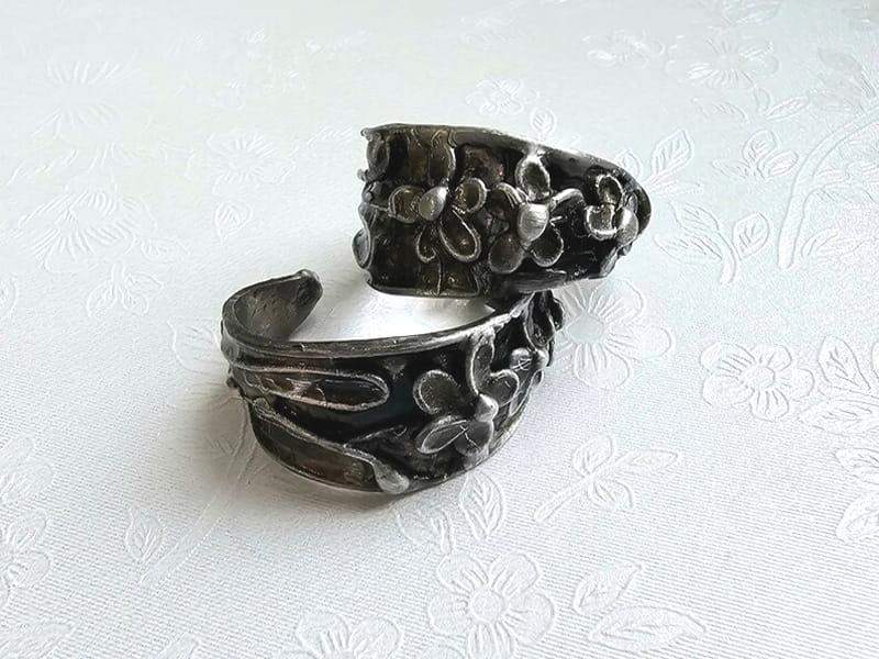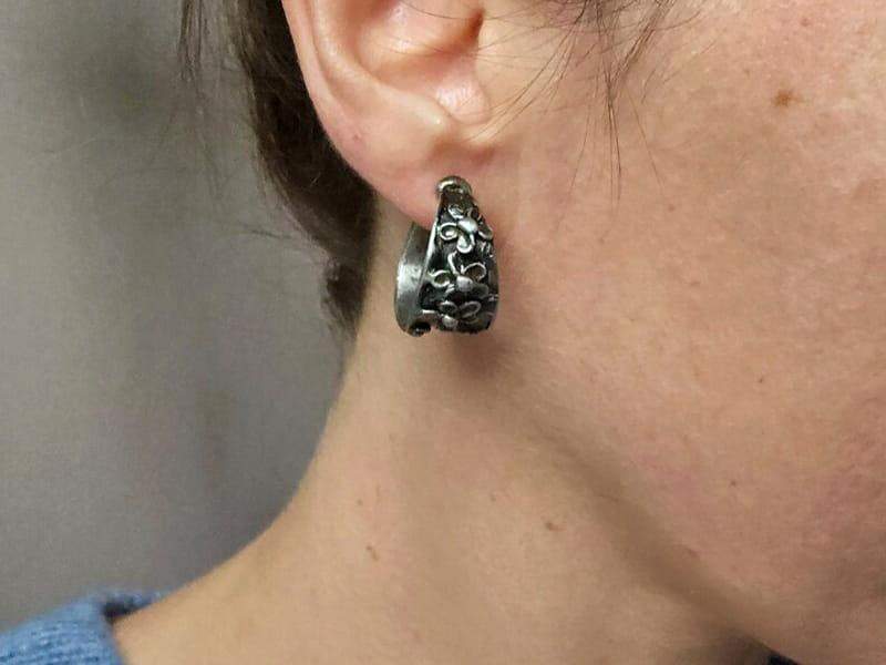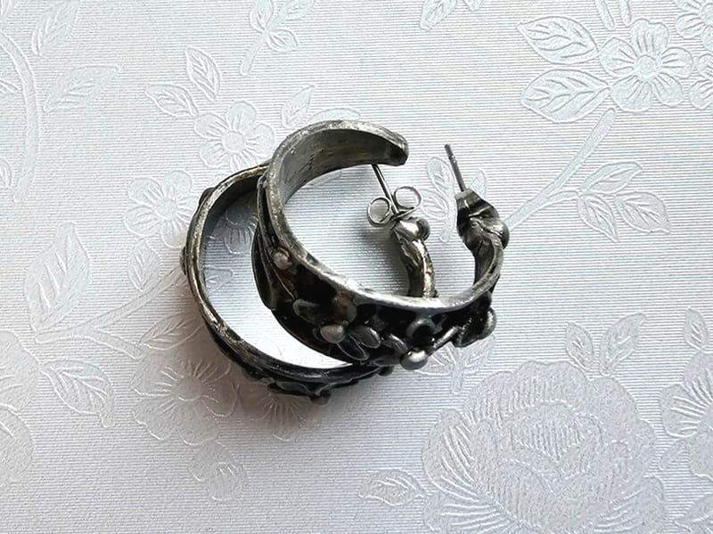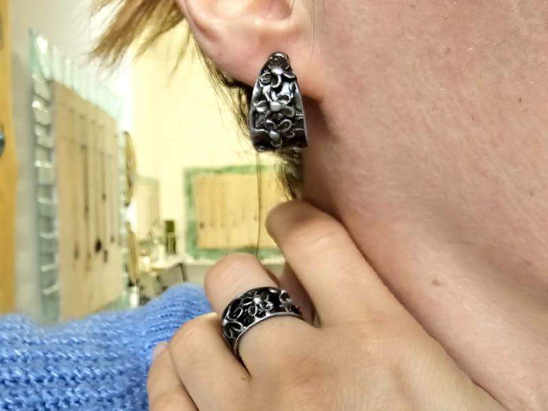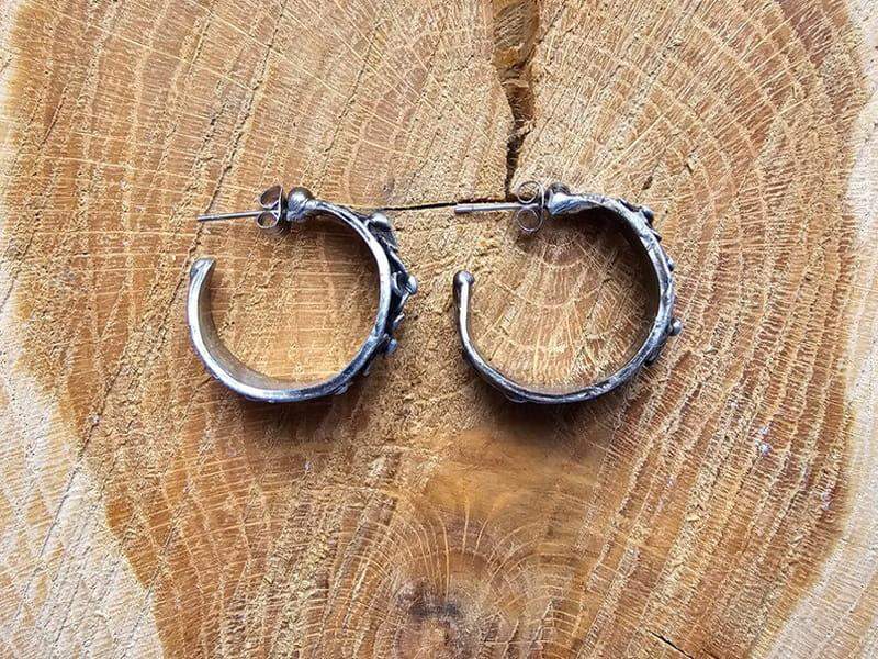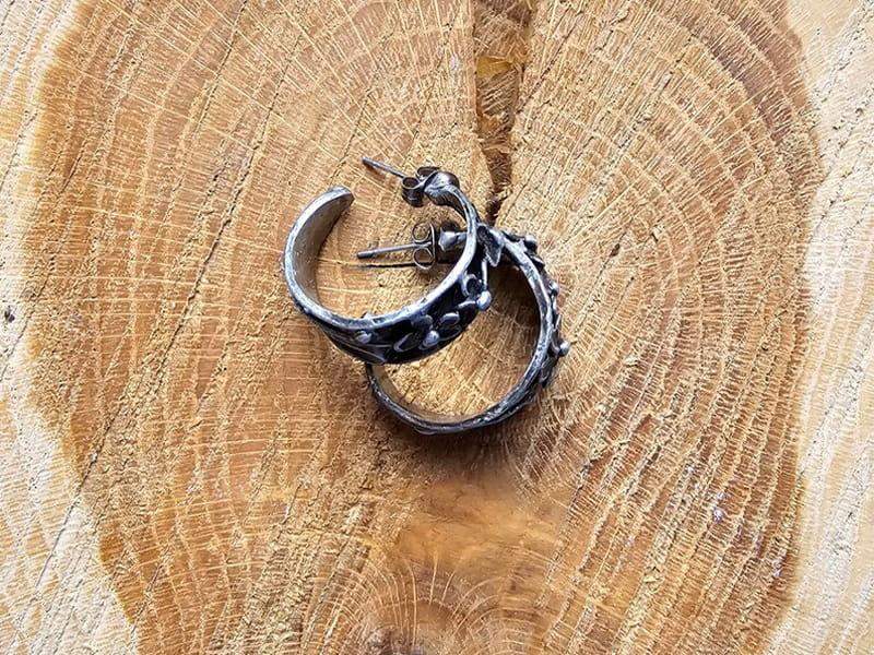 Lekkie, wiszące kolczyki w kształcie gałązki niezapominajek. Kolczyki wykonane techniką metaloplastyki.