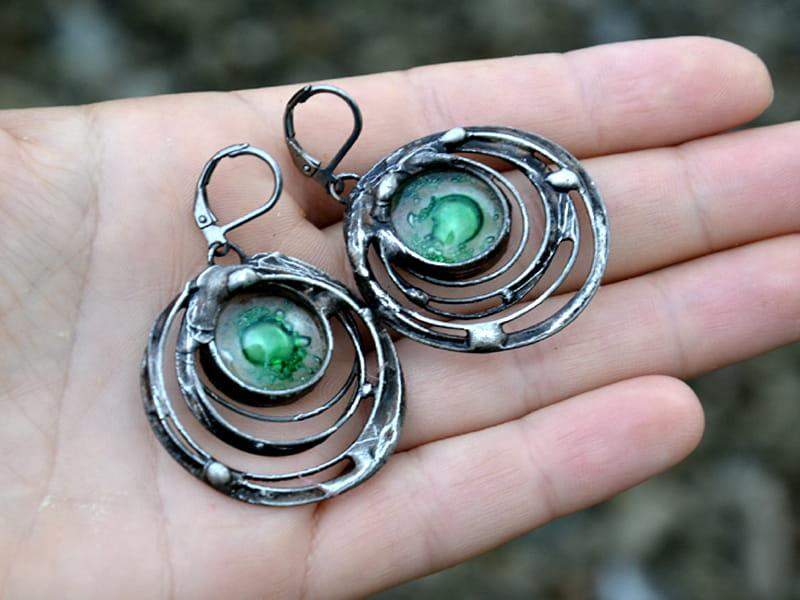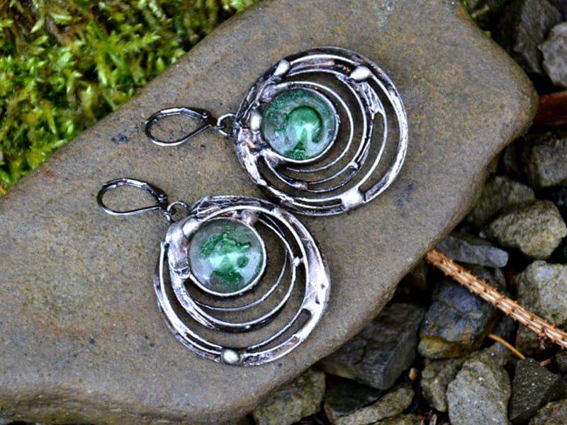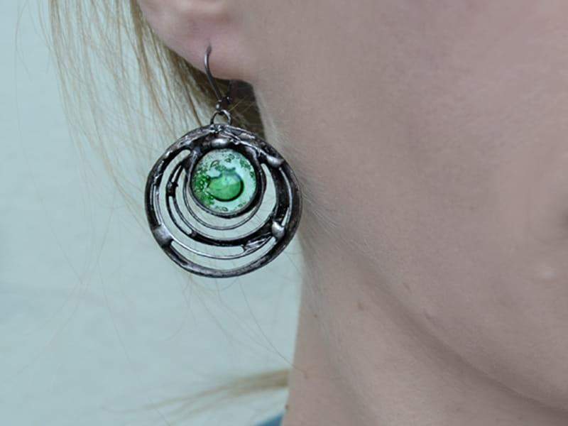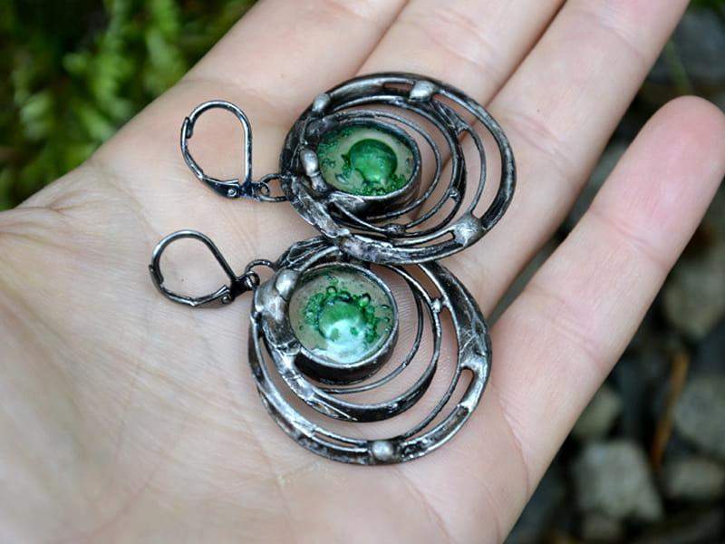 Unikatowe kolczyki ze szkłem, w którym zatopiłam zielone bąbelki. Oprawa w kolorze starego srebra nadaje kolczykom uroku. Długość całego kolczyka to ok. 5 cm. Biżuteria w 100% wykonana ręcznie, poszczególne sztuki mogą się minimalnie różnić.