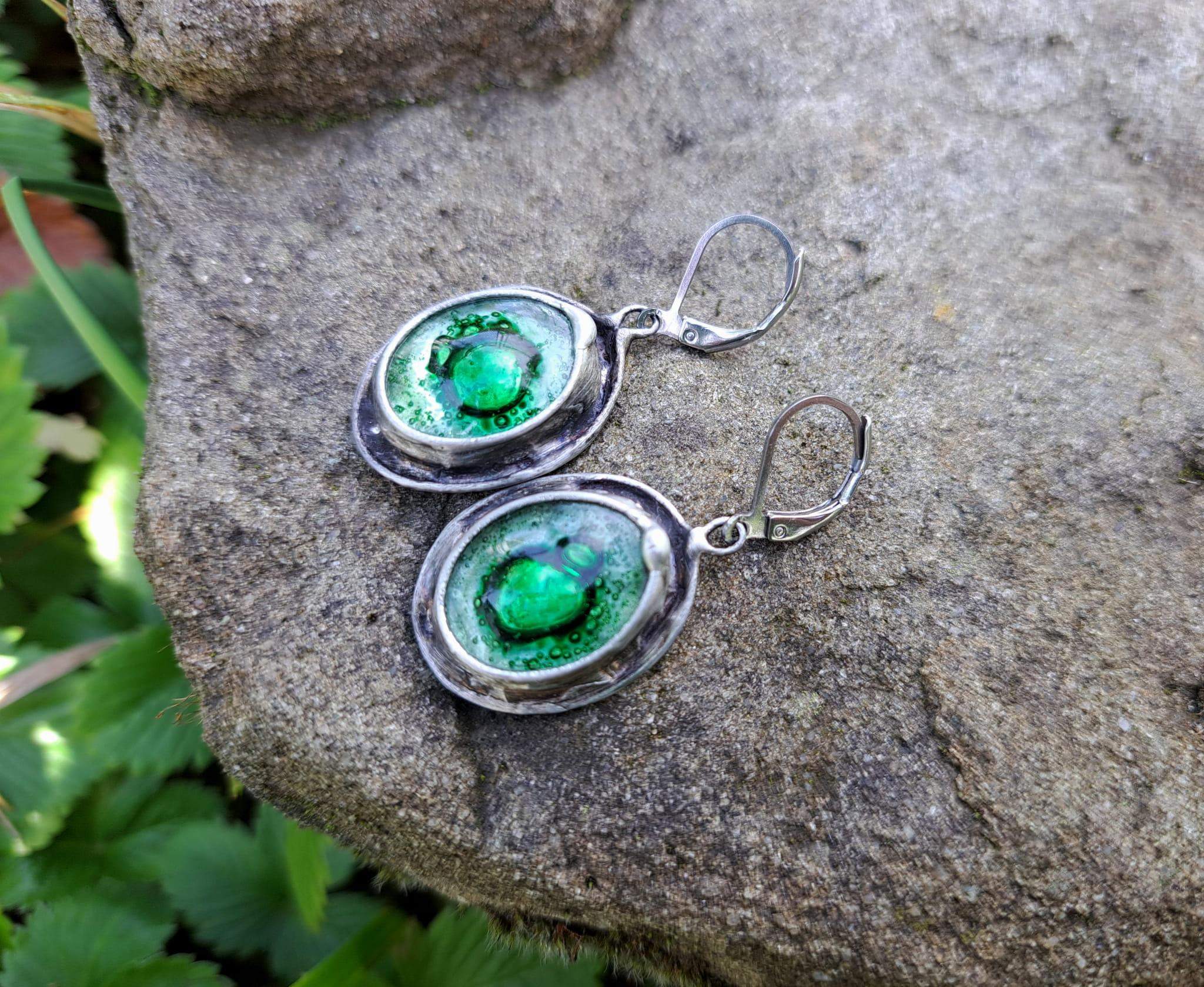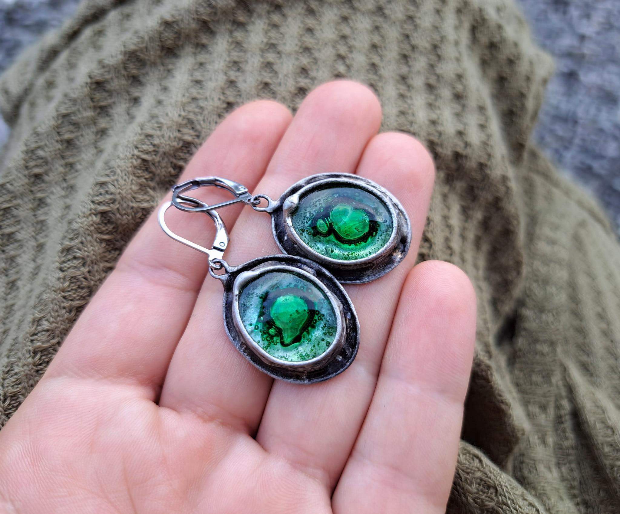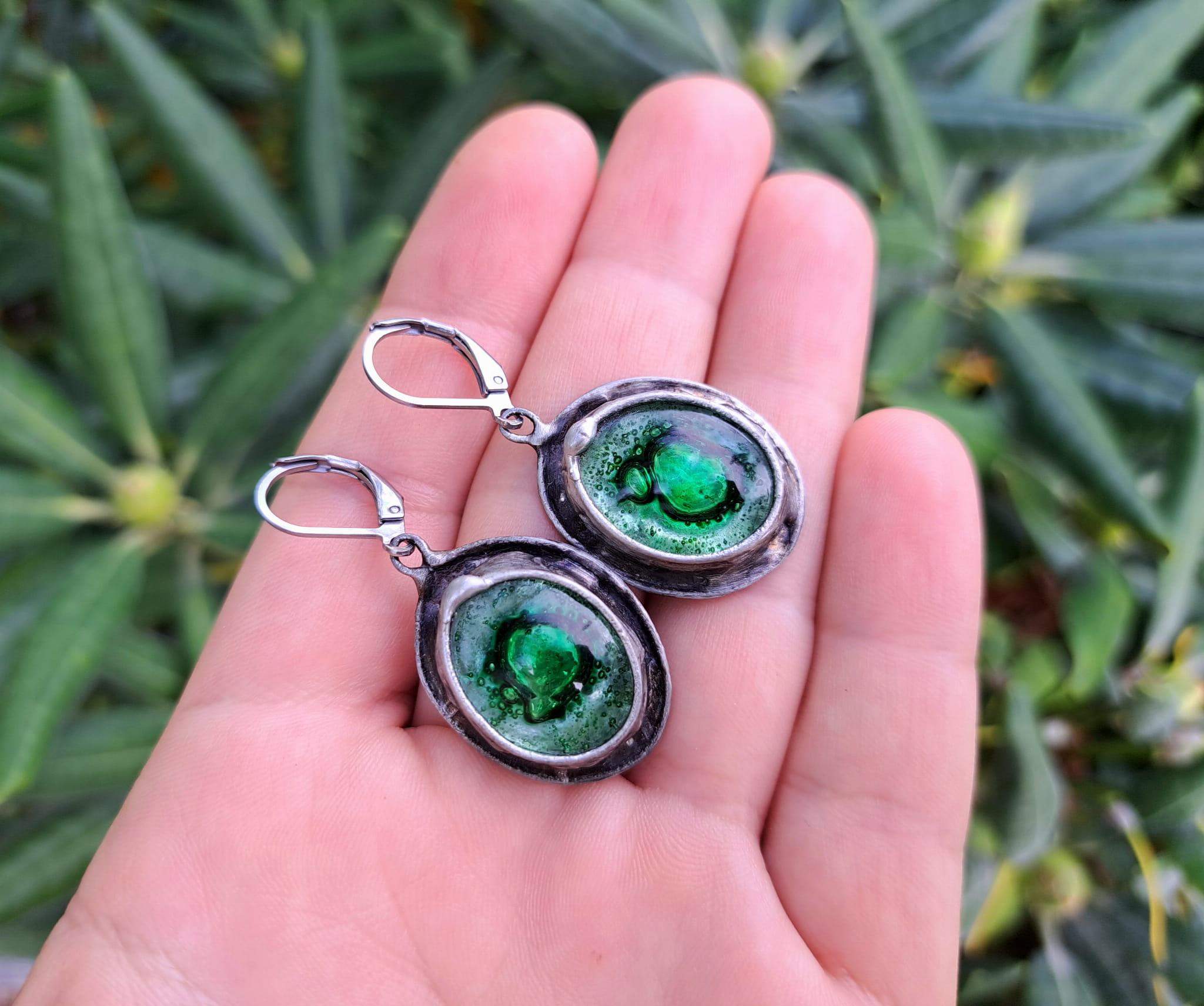Kolczyki wykonane zostały metodą witrażową ze szkła, miedzi i ekologicznej cyny.