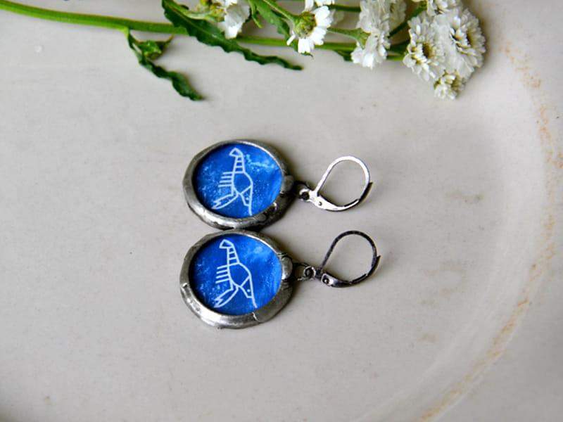 Kolczyki z wizerunkiem langusty (symbol "Langusty Na Palmie" Ojca Adama Szustaka). Rustykalna oprawa wykonana z ekologicznej cyny stylizowanej na ciemne srebro. Długość kolczyka to ok. 4 cm. Biżuteria w 100% wykonana ręcznie, poszczególne sztuki mogą się minimalnie różnić.