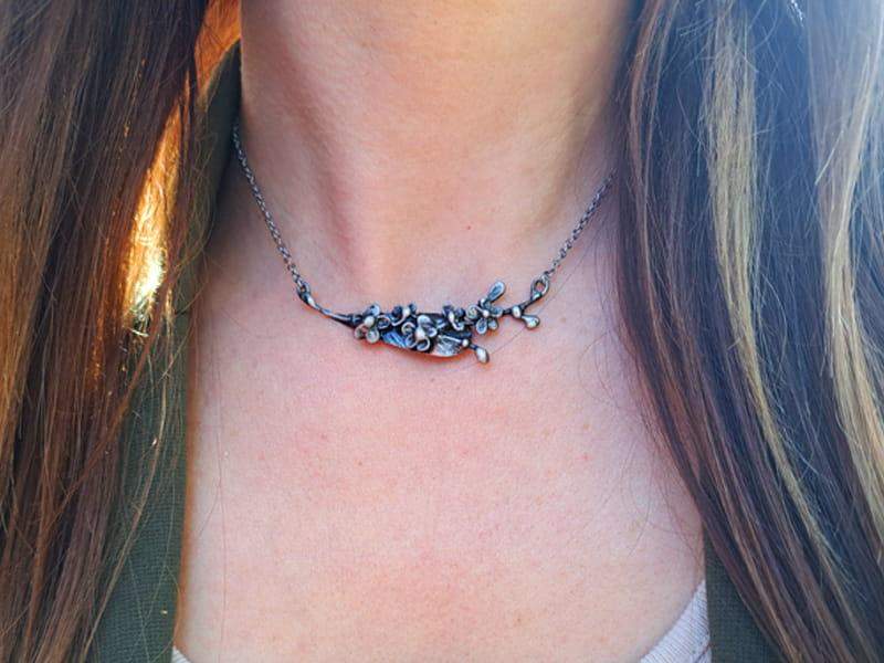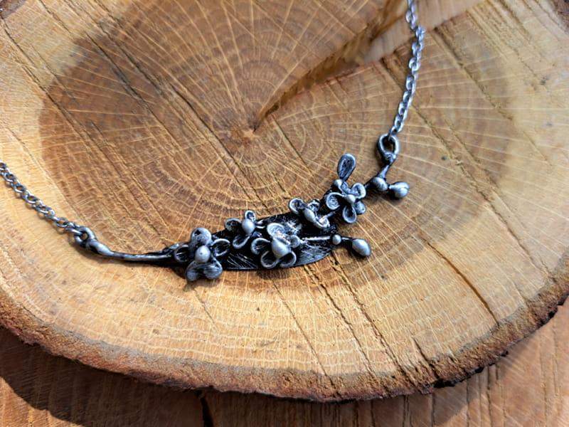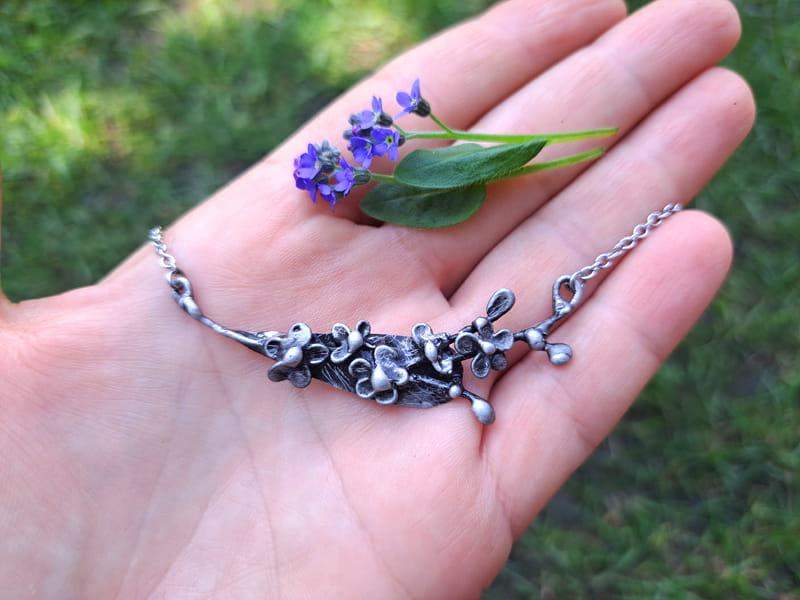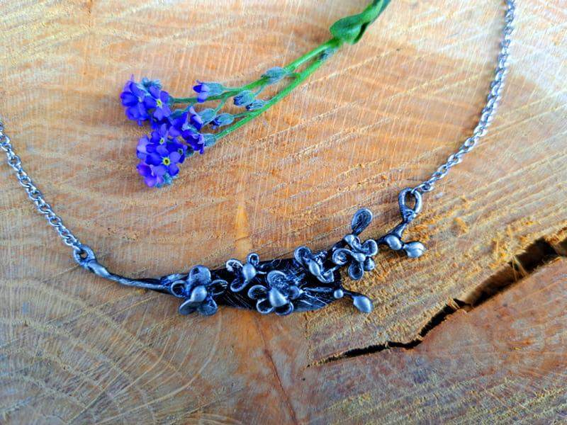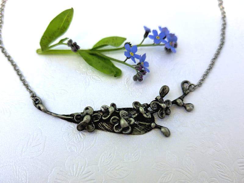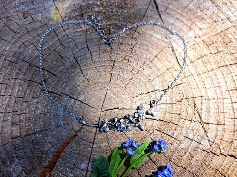 Kolia w kształcie gałązki niezapominajek. Biżuteria wykonana jest techniką metaloplastyki.
