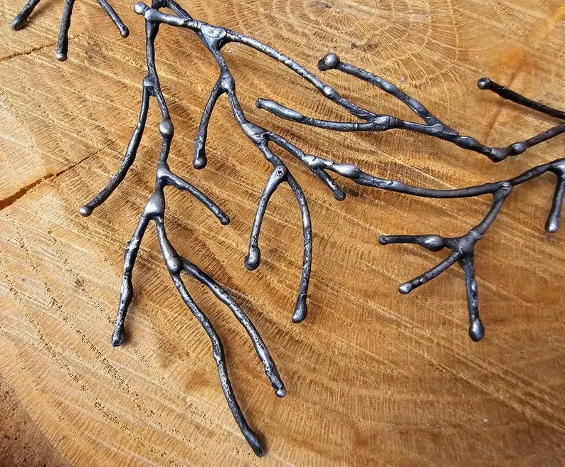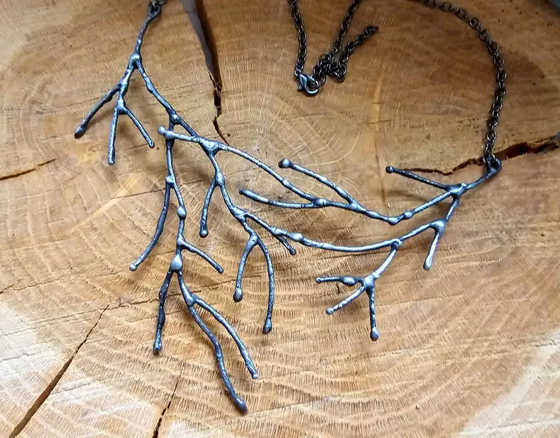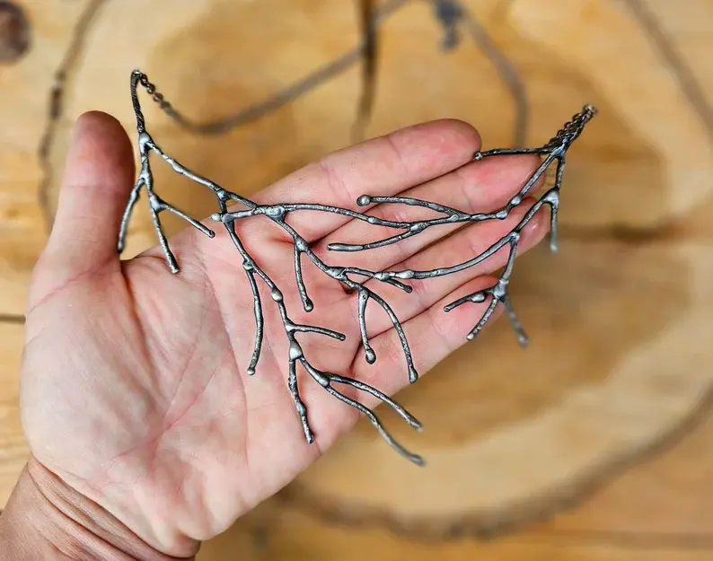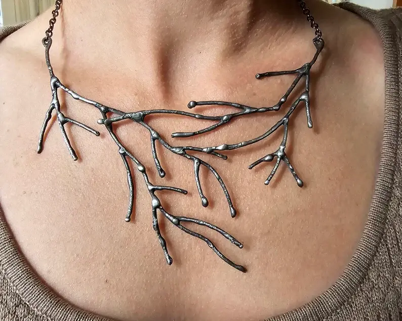 Rustykalna, efektowna kolia w kształcie gałązki. Biżuteria wykonana jest techniką metaloplastyki.