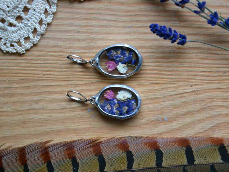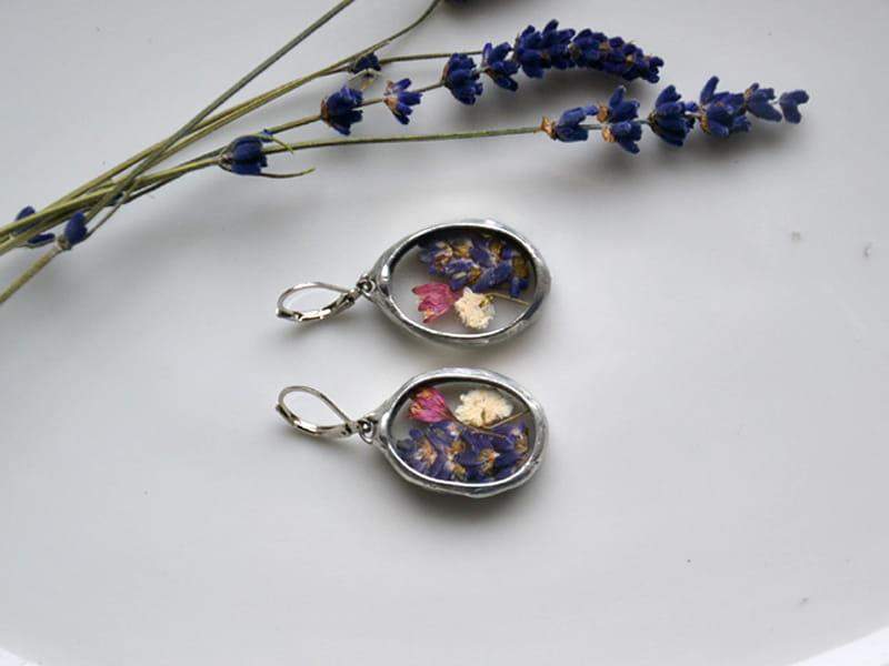 Romantyczne kolczyki z lawendą, dzwonkami i gipsówką zamkniętymi w szkle. Oprawa wykonana z ekologicznej cyny w kolorze srebrnym. Zamykane antyalergiczne bigle. Długość kolczyka to ok. 4,5 cm. Biżuteria w 100% wykonana ręcznie, poszczególne sztuki mogą się minimalnie różnić.