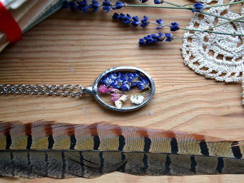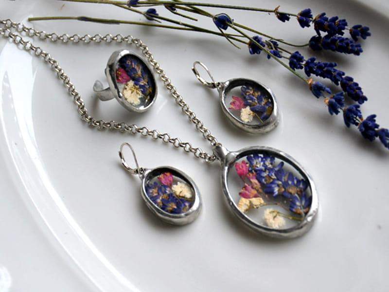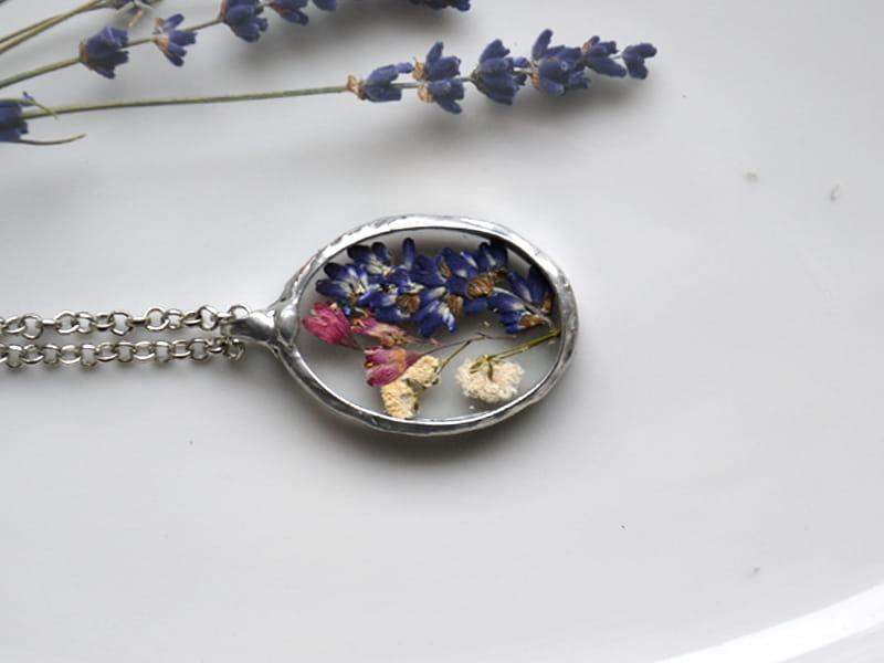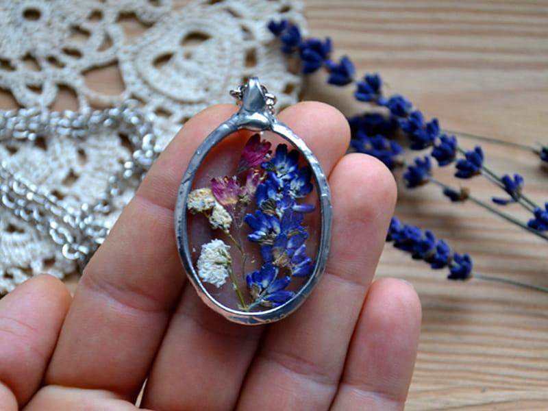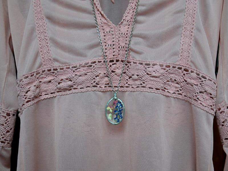 Romantyczny naszyjnik z kwiatami zamkniętymi w szkle.