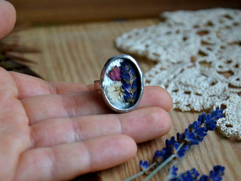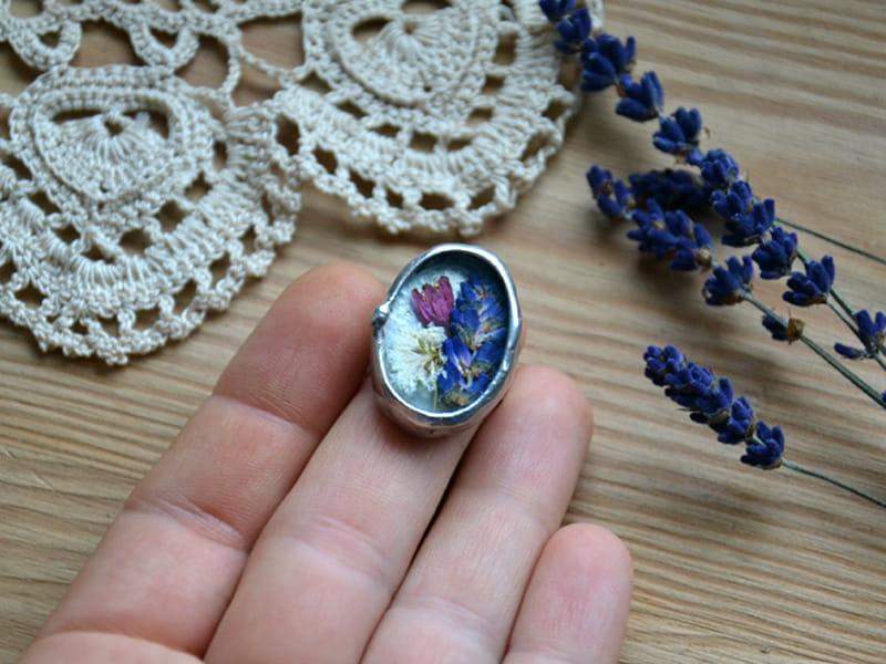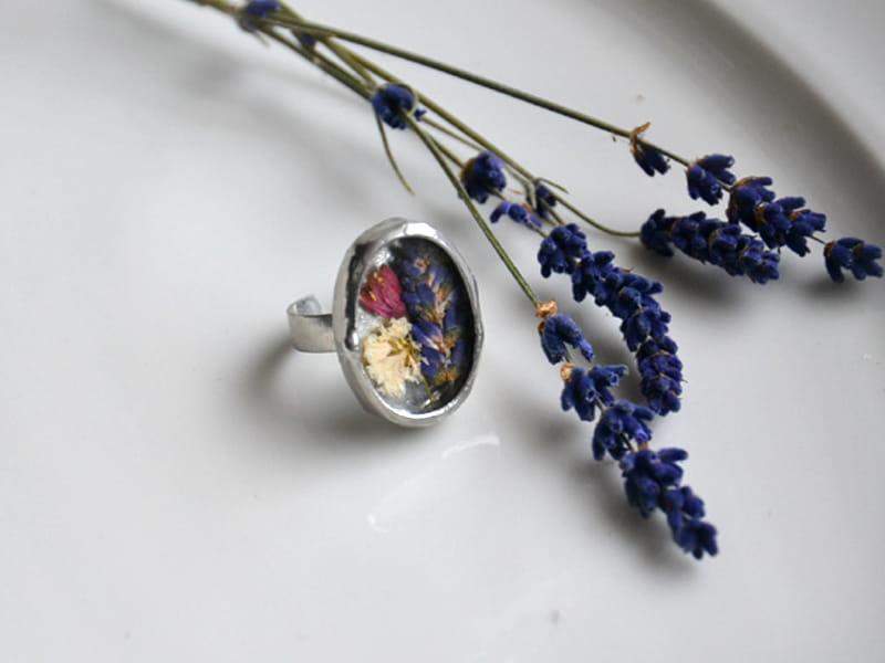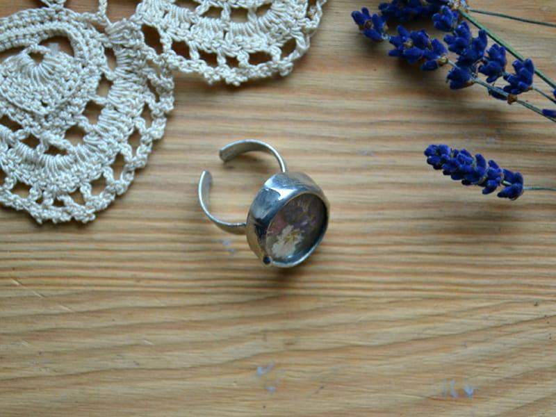 Pierścionek z kwiatami zamkniętymi w szkle.