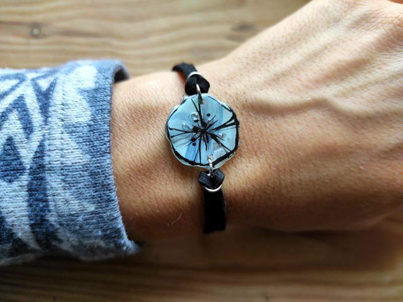Urocza bransoletka ze szkiełkiem w kształcie kwiatuszka. Kwiat został ręcznie wycięty ze szkła, pomalowany i wypalony w bardzo wysokiej temperaturze, dzięki czemu malunek jest trwały, a brzegi szkła gładkie i zaokrąglone.