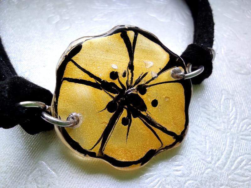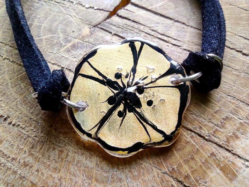 Urocza bransoletka ze szkiełkiem w kształcie kwiatuszka. Kwiat został ręcznie wycięty ze szkła, pomalowany i wypalony w bardzo wysokiej temperaturze, dzięki czemu malunek jest trwały, a brzegi szkła gładkie i zaokrąglone.
