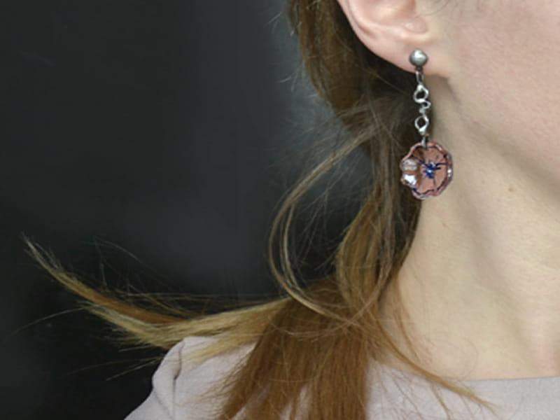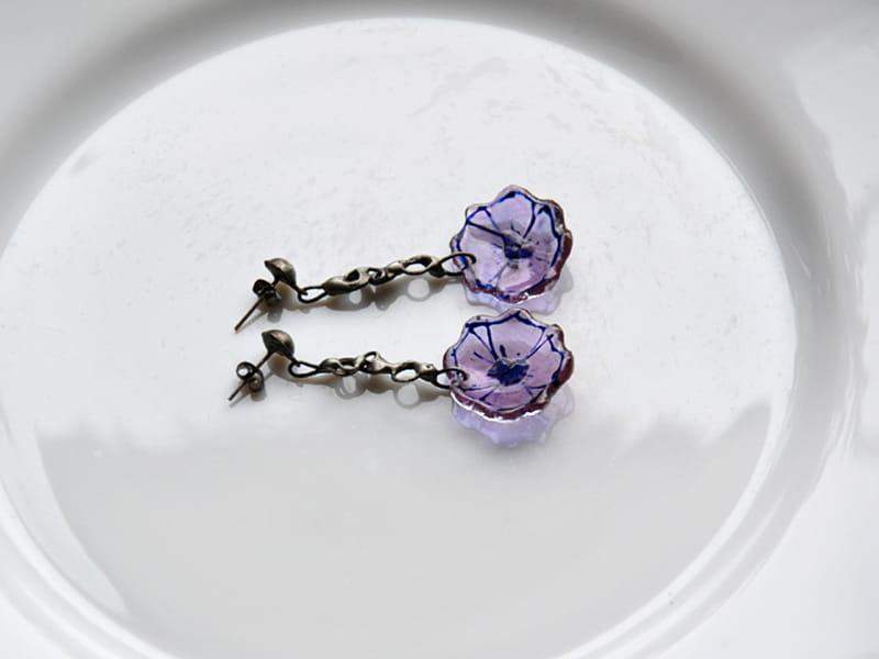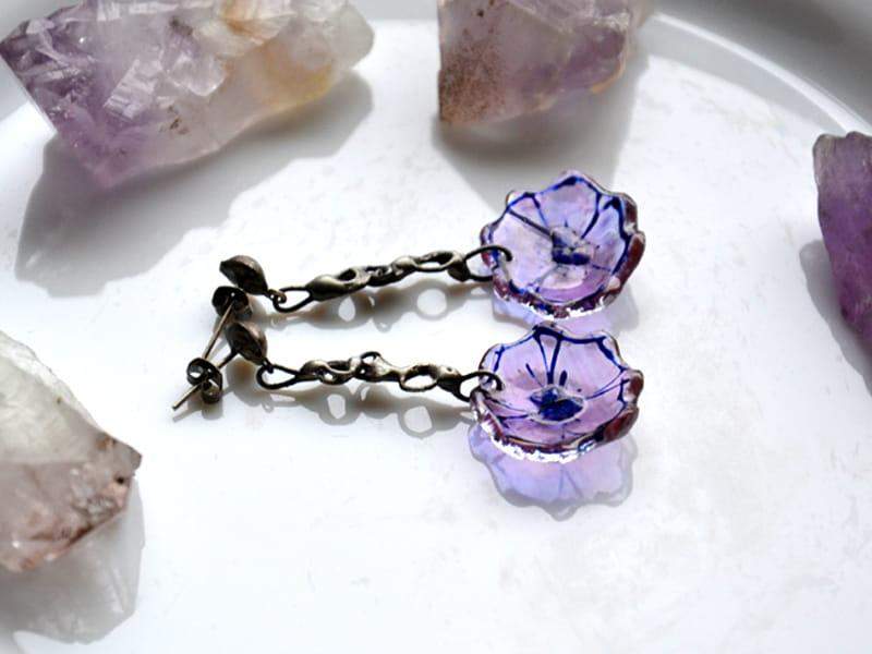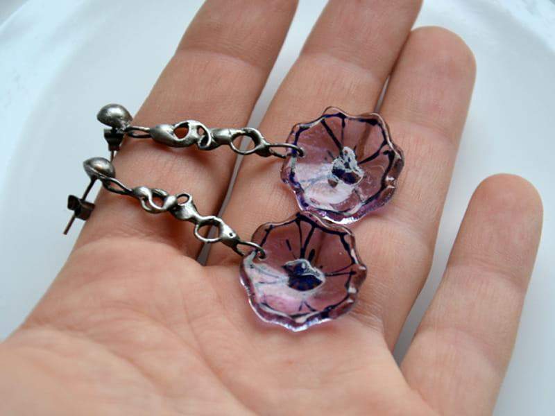 Delikatne, lekkie, długie kolczyki ze szklanym kwiatuszkiem w delikatnym fiolecie. Szkło malowane, uformowane na kształt kielicha kwiatu i poddane obróbce termicznej, dzięki czemu jest trwałe i wodoodporne. Wykończenie stylizowane na stare srebro. Długość całego kolczyka 5 cm. Biżuteria w 100% wykonana ręcznie, poszczególne sztuki mogą się minimalnie różnić.