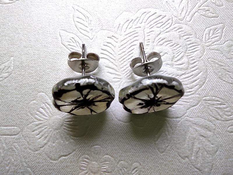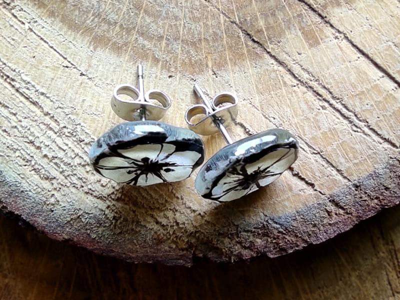 Urocze kolczyki ze szkiełkami w kształcie kwiatuszków. Kwiaty zostały ręcznie wycięte ze szkła, pomalowane i wypalone w bardzo wysokiej temperaturze, dzięki czemu malunek jest trwały, a brzegi szkła gładkie i zaokrąglone.