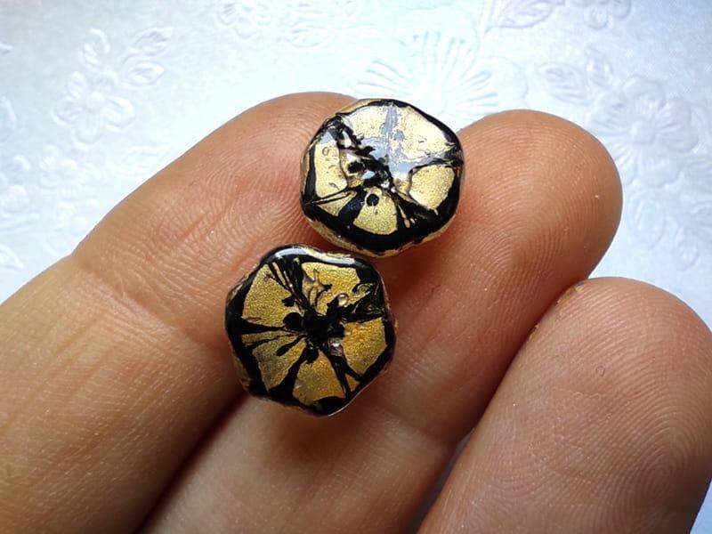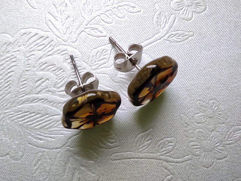 Urocze kolczyki ze szkiełkami w kształcie kwiatuszków. Kwiaty zostały ręcznie wycięte ze szkła, pomalowane i wypalone w bardzo wysokiej temperaturze, dzięki czemu malunek jest trwały, a brzegi szkła gładkie i zaokrąglone.