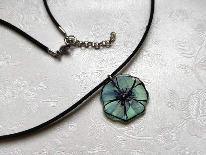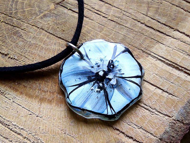 Uroczy naszyjnik ze szkiełkiem w kształcie kwiatuszka. Kwiat został ręcznie wycięty ze szkła, pomalowany i wypalony w bardzo wysokiej temperaturze, dzięki czemu malunek jest trwały, a brzegi szkła gładkie i zaokrąglone.
