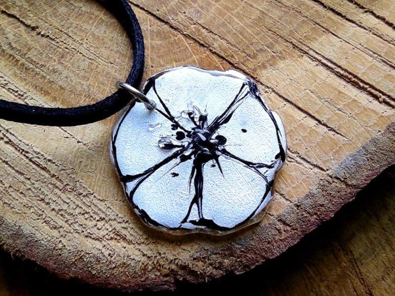 Uroczy naszyjnik ze szkiełkiem w kształcie kwiatuszka. Kwiat został ręcznie wycięty ze szkła, pomalowany i wypalony w bardzo wysokiej temperaturze, dzięki czemu malunek jest trwały, a brzegi szkła gładkie i zaokrąglone.