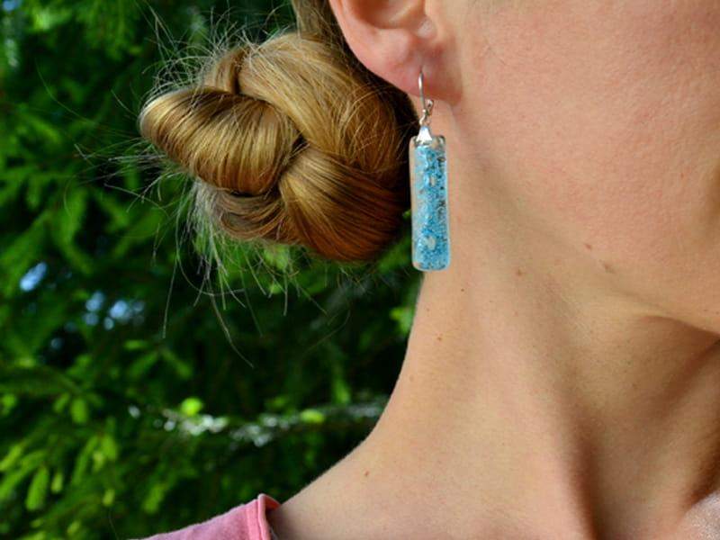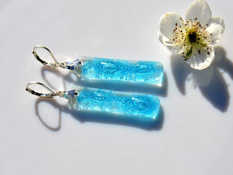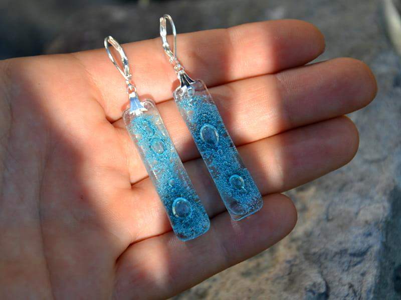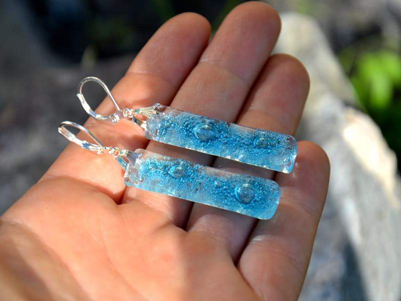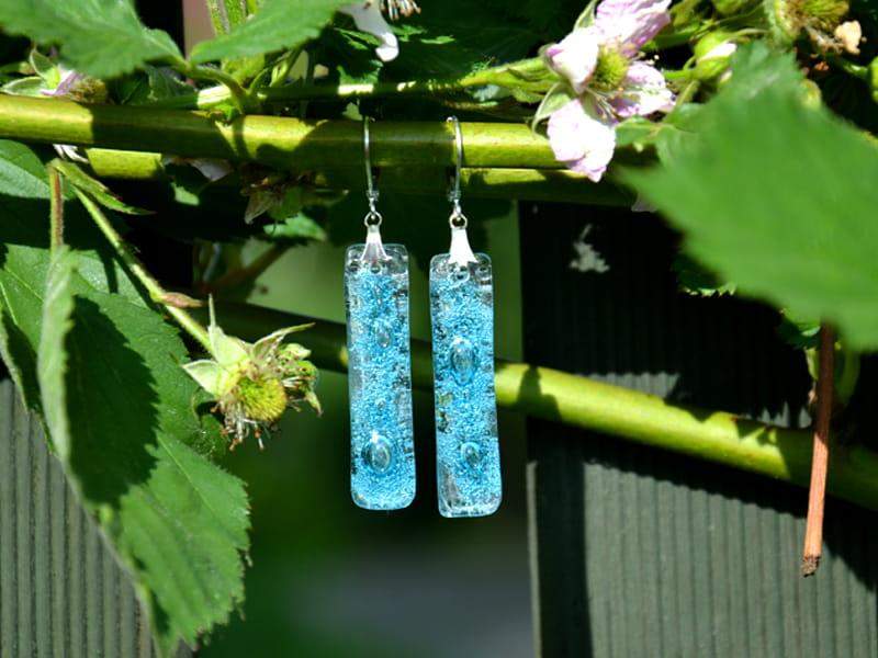 Delikatne, lekkie szklane kolczyki. Wytopione przeze mnie szkło pełne jest turkusowych bąbelków. Wykończenie w kolorze srebrnym. Długość kolczyka to 5,5 cm. Biżuteria w 100% wykonana ręcznie, poszczególne sztuki mogą się minimalnie różnić.