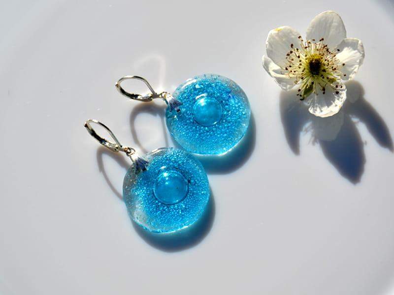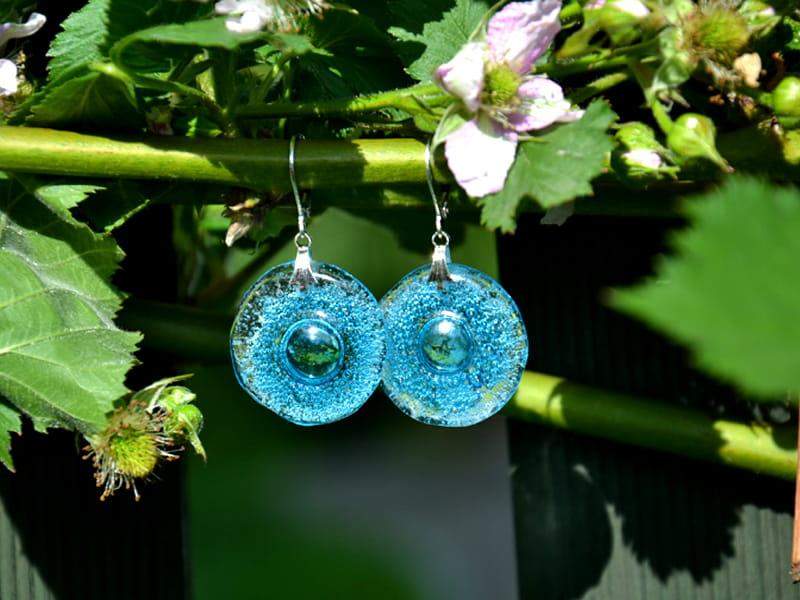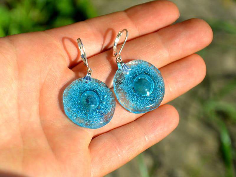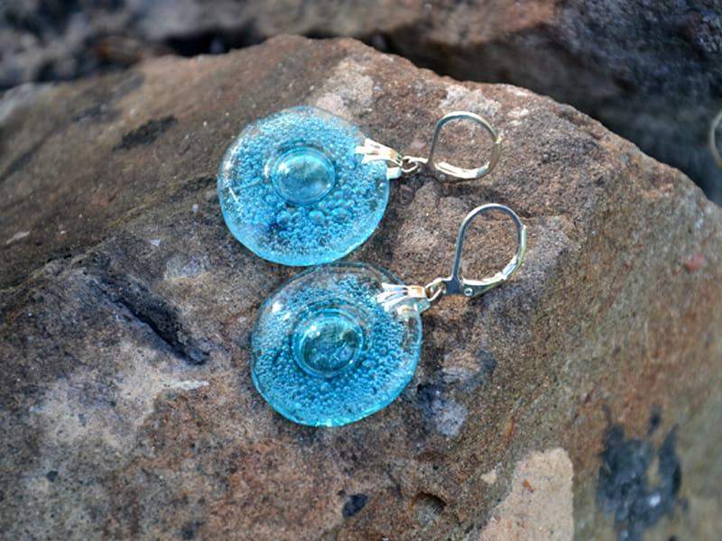 Delikatne, lekkie szklane kolczyki. Wytopione przeze mnie szkło pełne jest turkusowych bąbelków. Wykończenie w kolorze srebrnym. Długość kolczyka to 4 cm. Biżuteria w 100% wykonana ręcznie, poszczególne sztuki mogą się minimalnie różnić.