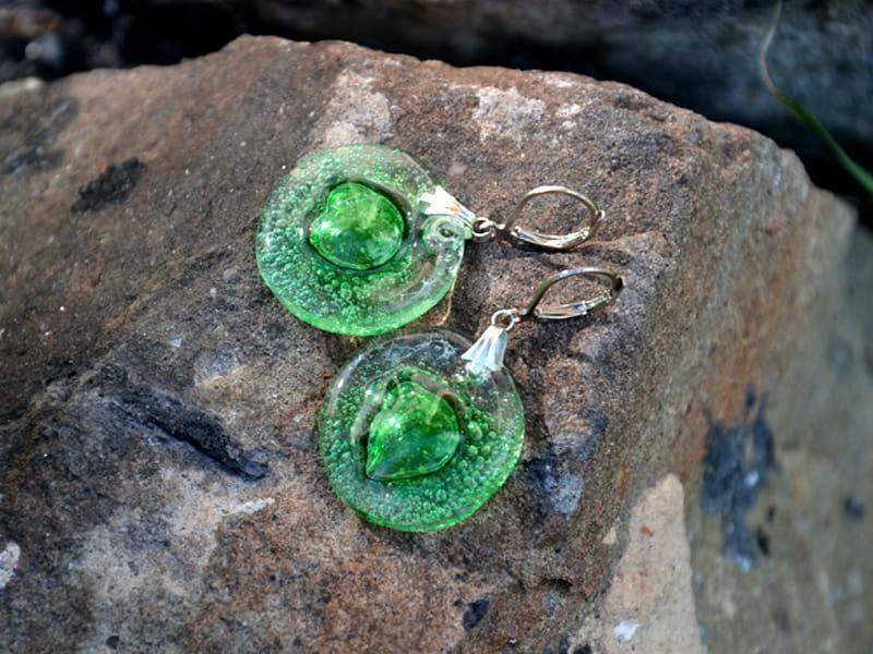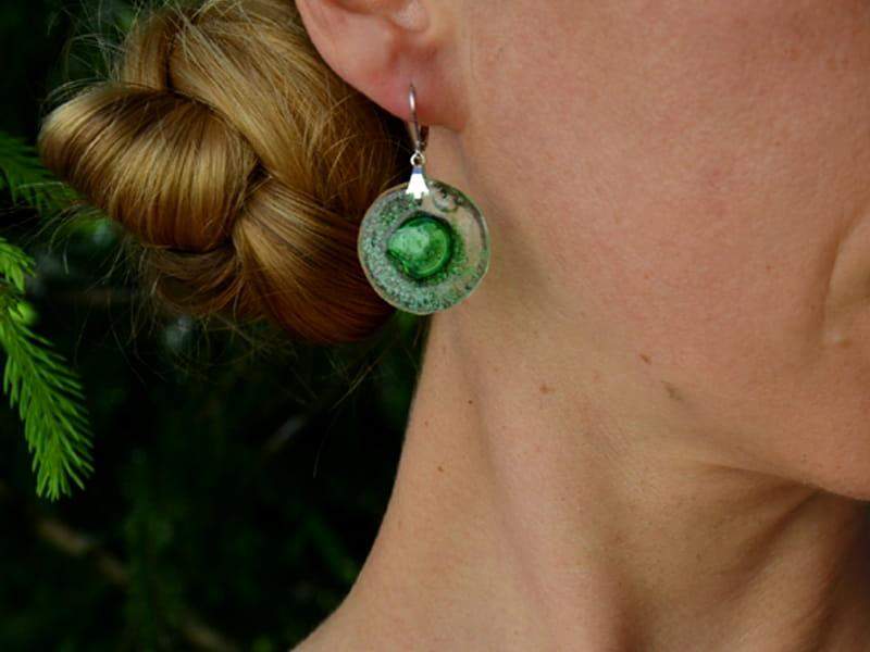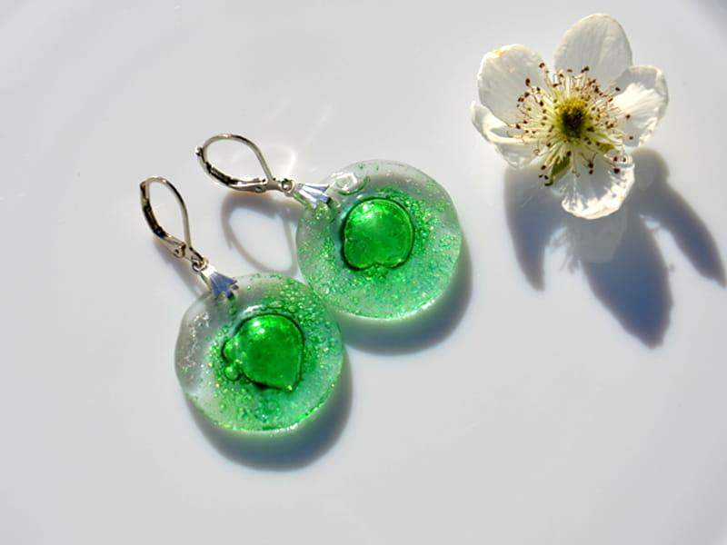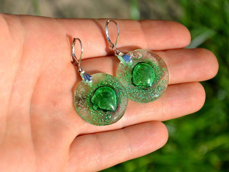 Delikatne, lekkie szklane kolczyki. Wytopione przeze mnie szkło pełne jest zielonych bąbelków. Wykończenie w kolorze srebrnym. Długość kolczyka to 4 cm. Biżuteria w 100% wykonana ręcznie, poszczególne sztuki mogą się minimalnie różnić.