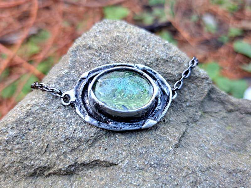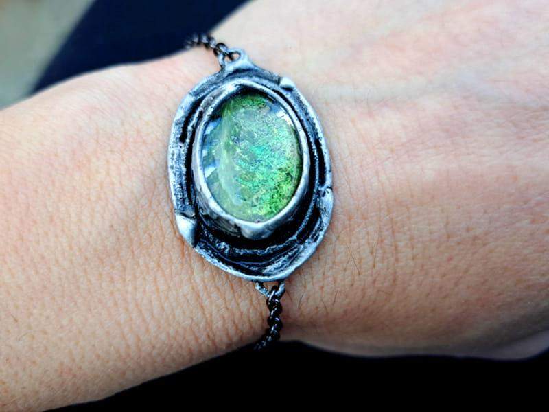 Bransoletka wykonana została metodą witrażową ze szkła, miedzi i ekologicznej cyny. Oprawa stylizowana jest na kolor ciemnego srebra. Łańcuszek wykonany jest z materiałów antyalergicznych.