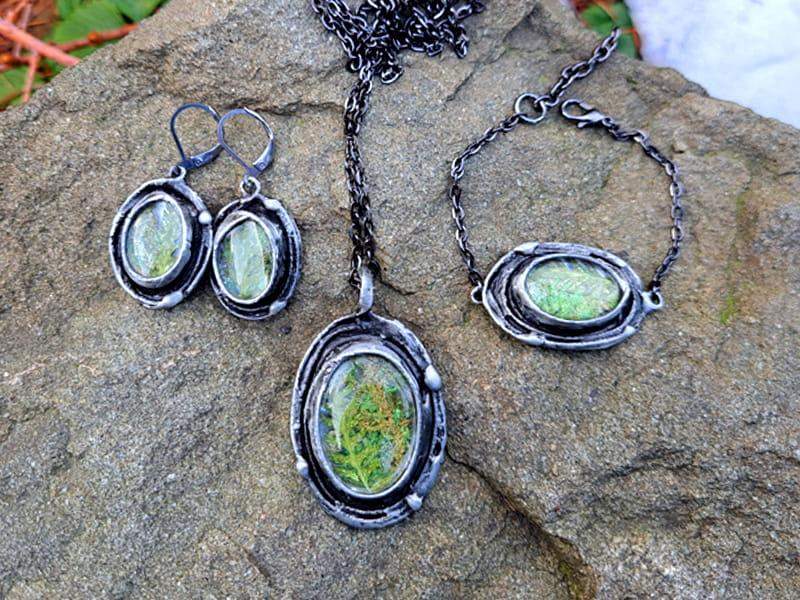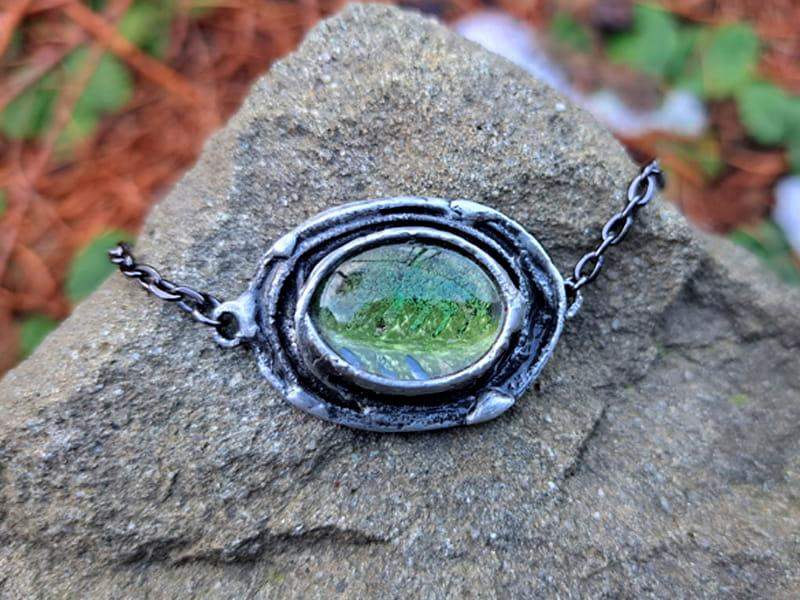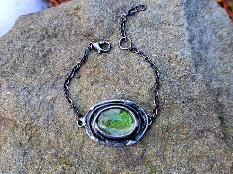 Efektowna bransoletka z mchem i paprocią zamkniętymi w owalnym, wypukłym szkle, otulonym rustykalną oprawą. Bransoletka stworzona z myślą o romantyczkach. Jeśli kochasz naturę, będzie dla Ciebie idealnym dodatkiem.