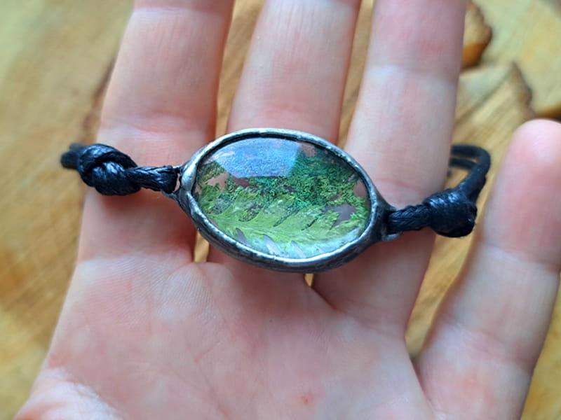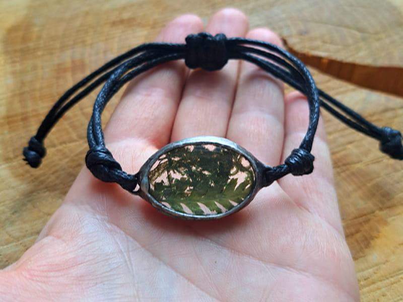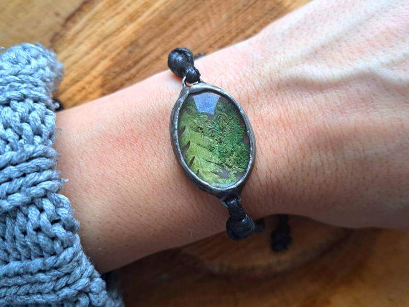 Roślinna bransoletka z mchem i paprocią zamkniętymi w owalnym, wypukłym szkle, na wiązanym, regulowanym sznurku. Bransoletka będzie idealnym dodatkiem dla osób kochających przyrodę i naturalny styl.