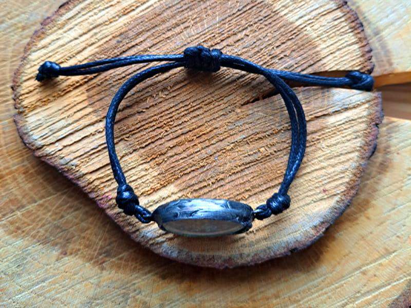 Bransoletka wykończona jest czarnym sznurkiem, dzięki któremu jej obwód jest regulowany.