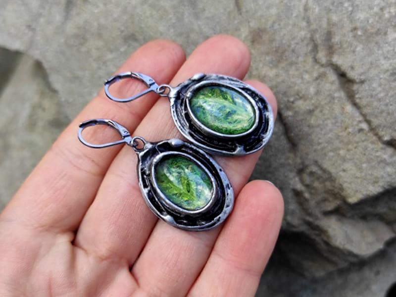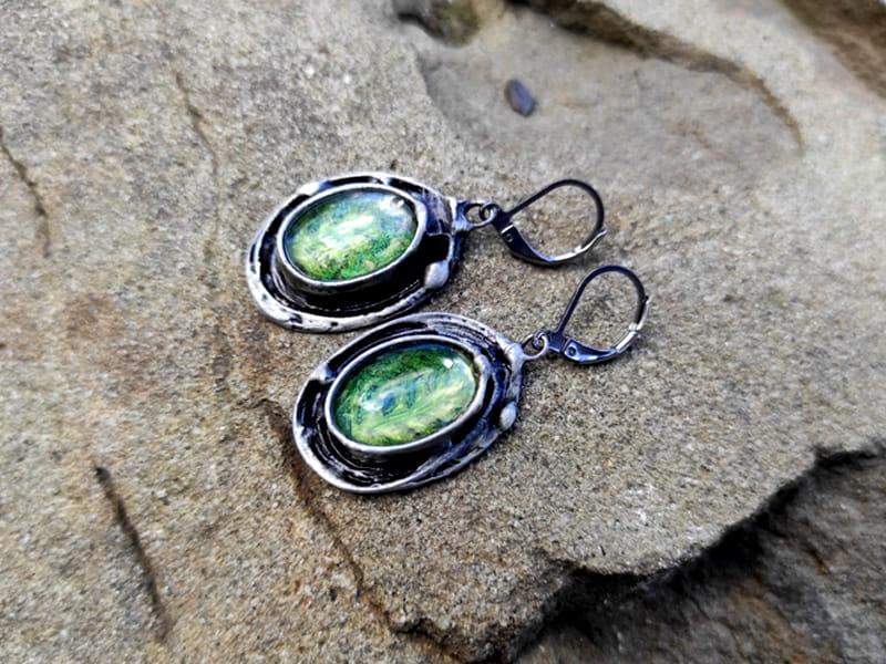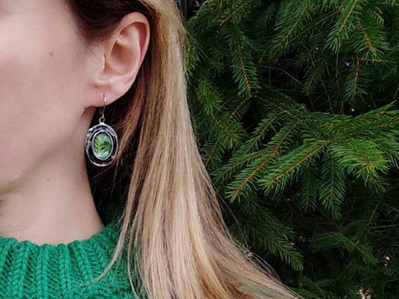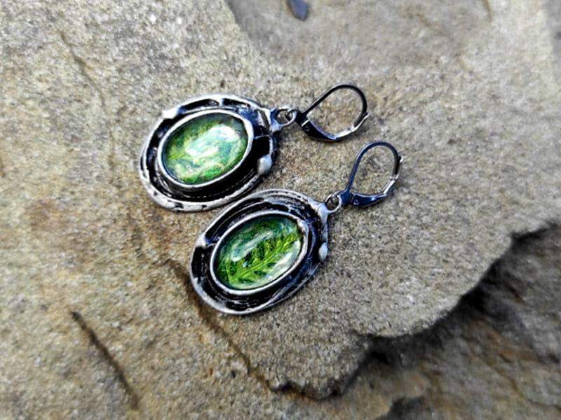 Leśne kolczyki z mchem i paprocią zamkniętymi w owalnych, wypukłych szkiełkach otulonych rustykaną oprawą. Kolczyki stworzone z myślą o romantyczkach. Jeśli kochasz naturę, będą dla Ciebie idealnym dodatkiem.