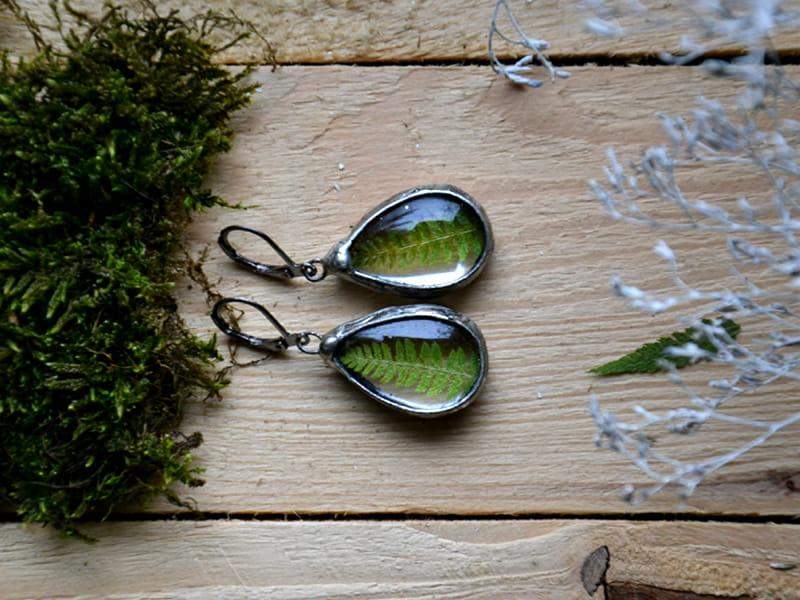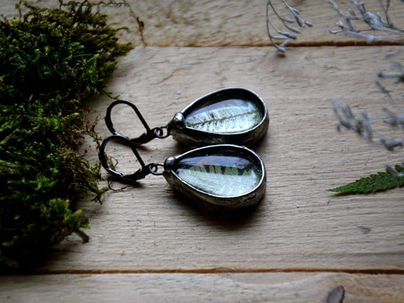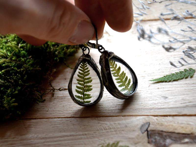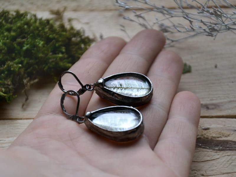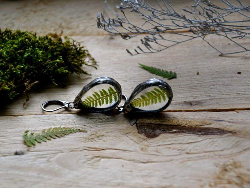 Kolczyki idealne dla romantyczki. W szkle zamknęłam liście paproci i oprawiłam w cynę stylizowaną na stare srebro. Długość kolczyka to ok. 4,5 cm. Biżuteria w 100% wykonana ręcznie, poszczególne sztuki mogą się minimalnie różnić.