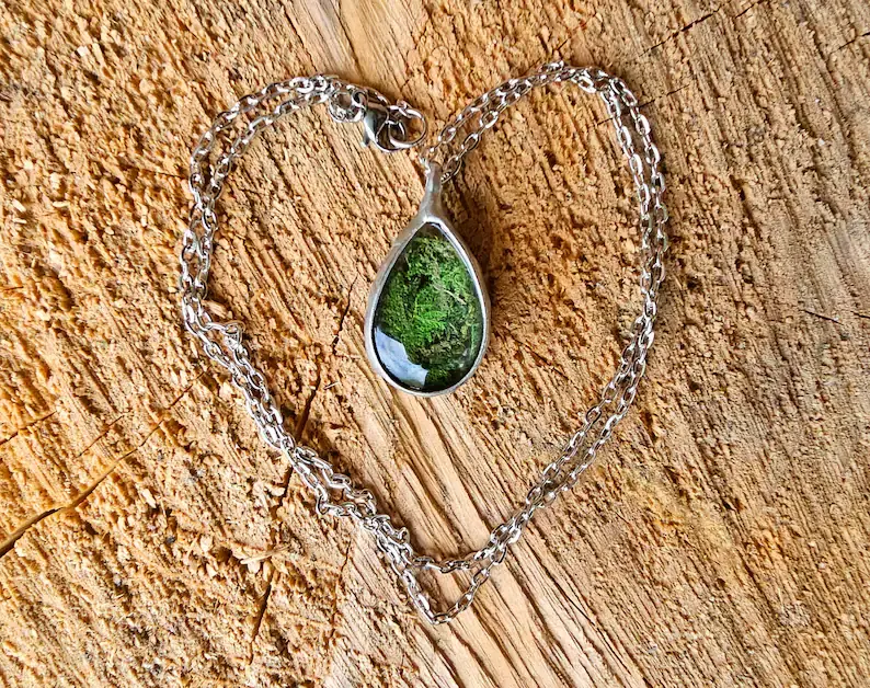 Efektowny naszyjnik z mchem zamkniętym w wypukłym szkle w kształcie kropli. Naszyjnik stworzony z myślą o romantyczkach. Jeśli kochasz naturę, będzie dla Ciebie idealnym dodatkiem.