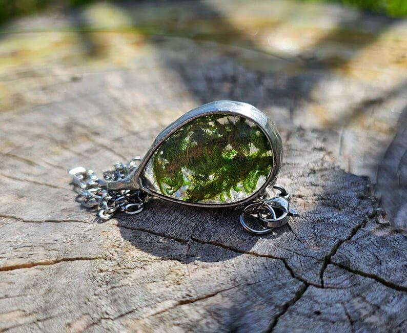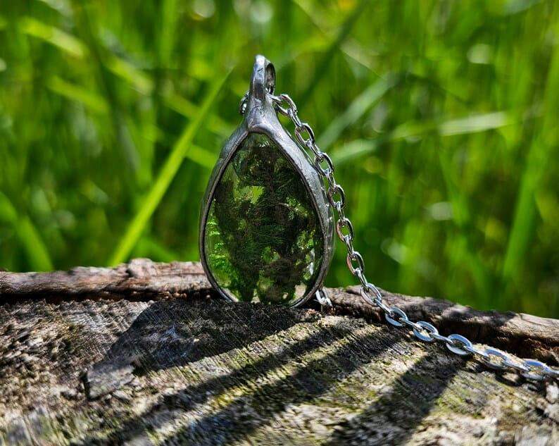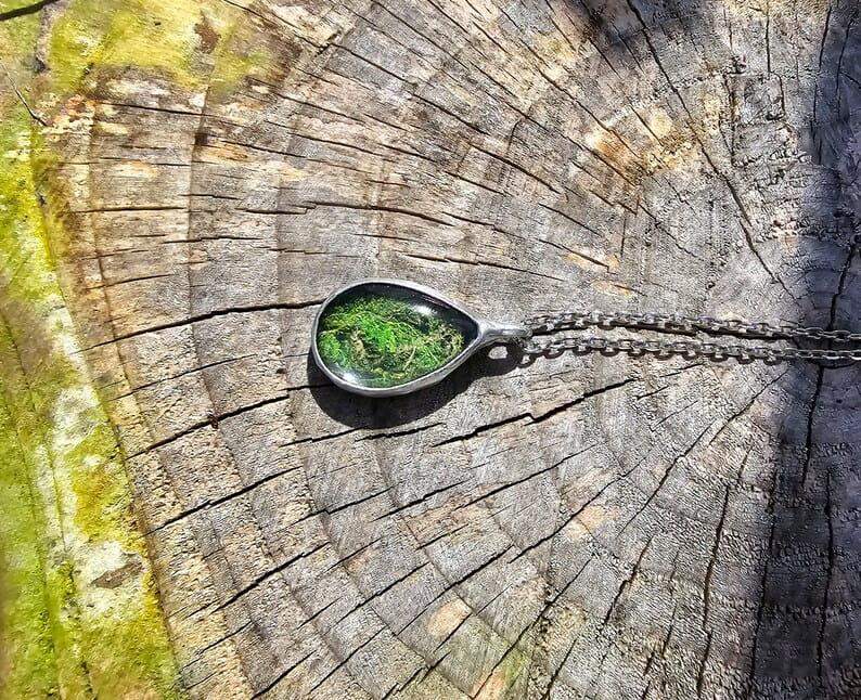 Leśny naszyjnik z mchem zamkniętym w szkiełku w kształcie kropli.