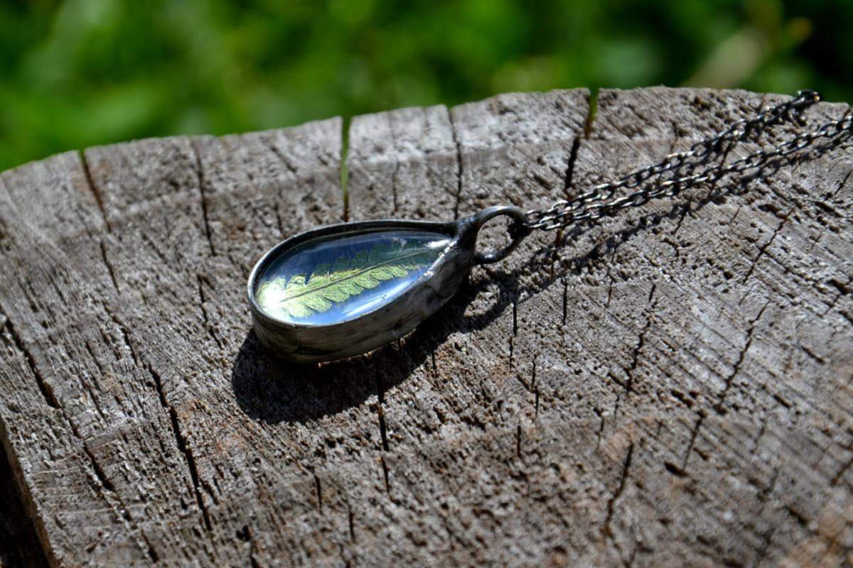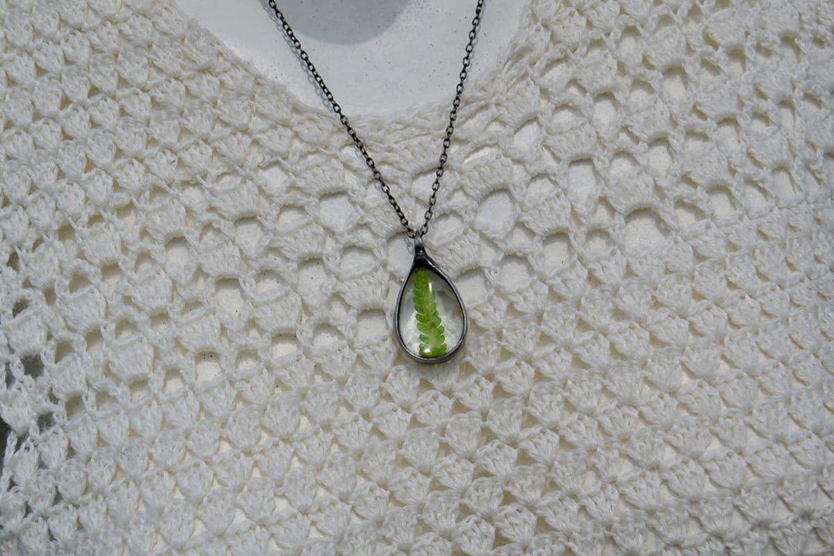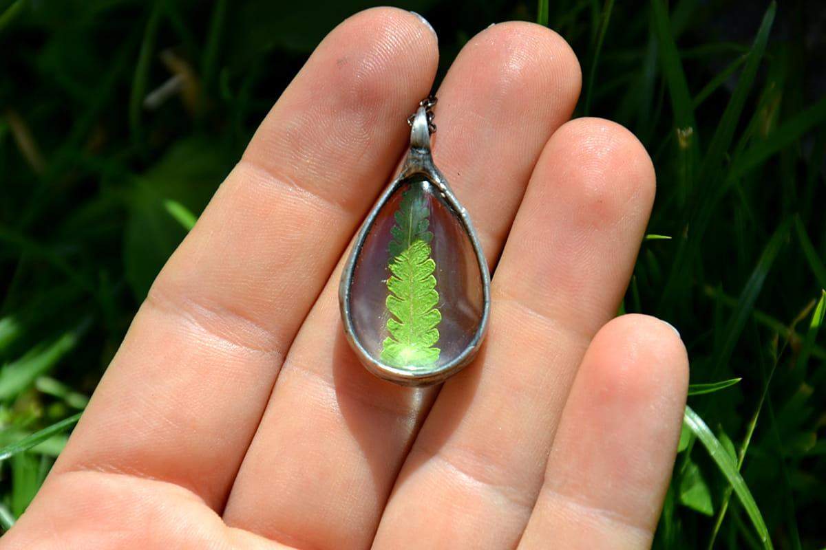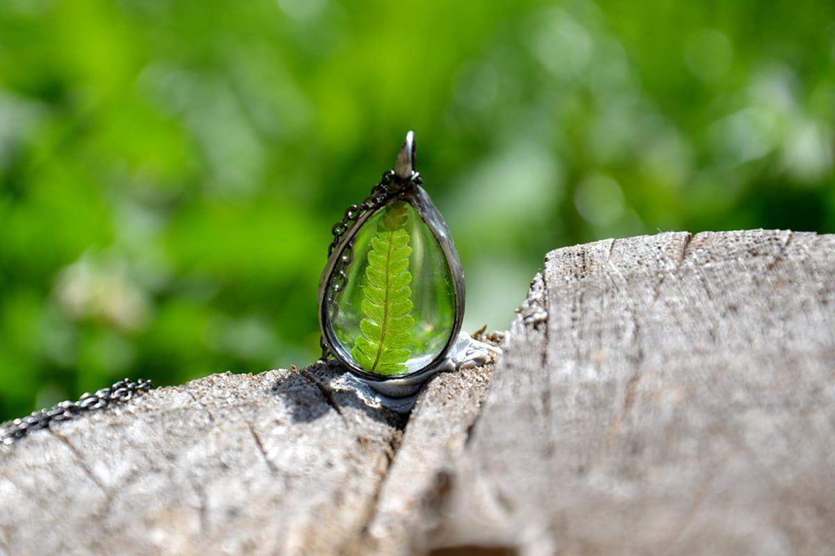 Delikatny naszyjnik z paprocią zamkniętą w szkle.