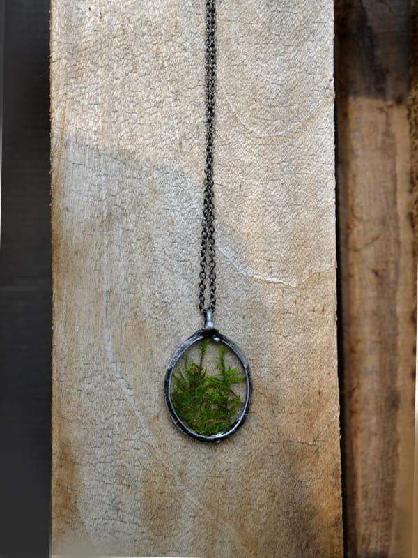 Wisior z zamkniętym w szkle mchem. Zawieszony na długim łańcuszku. Całość stylizowana na stare srebro. Wymiary zawieszki ok 3 x 5 cm. Biżuteria wykonana ręcznie, poszczególne egzemplarze mogą nieznacznie się między sobą różnić.