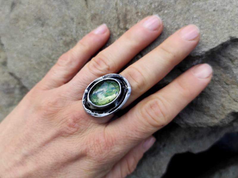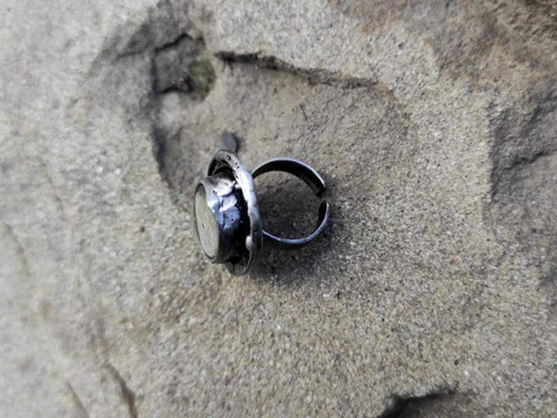 Efektowny, regulowany pierścionek z mchem i paprocią zamkniętymi w owalnym, wypukłym szkle, otulonym rustykalną oprawą. Pierścionek stworzony z myślą o romantyczkach. Jeśli kochasz naturę, będzie dla Ciebie idealnym dodatkiem.