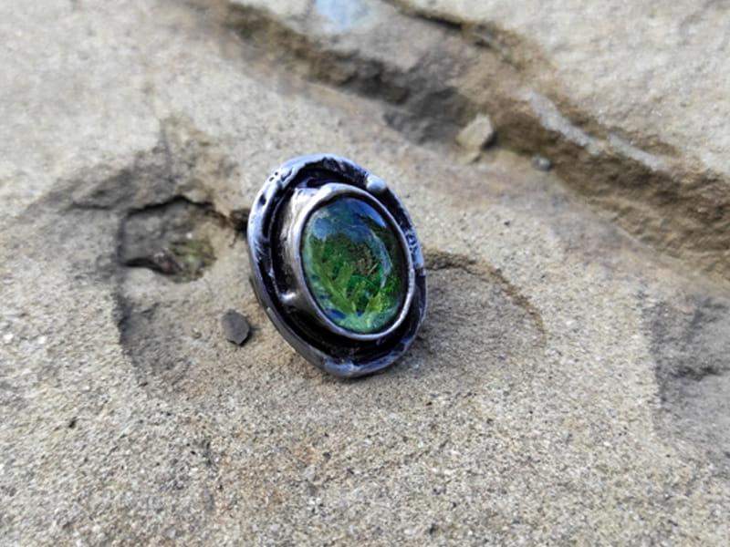 Pierścionek wykonany został metodą witrażową ze szkła, miedzi i ekologicznej cyny. Oprawa stylizowana jest na kolor ciemnego srebra. Obrączka regulowana.