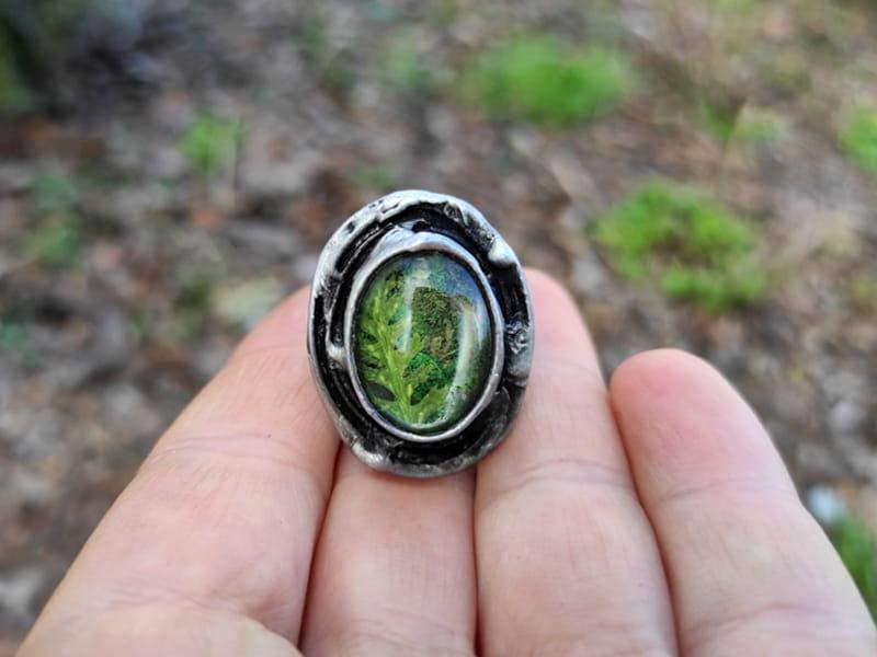 Leśny pierścionek z mchem i paprocią zamkniętymi w owalnym, wypukłym szkle, otulonym rustykalną oprawą.