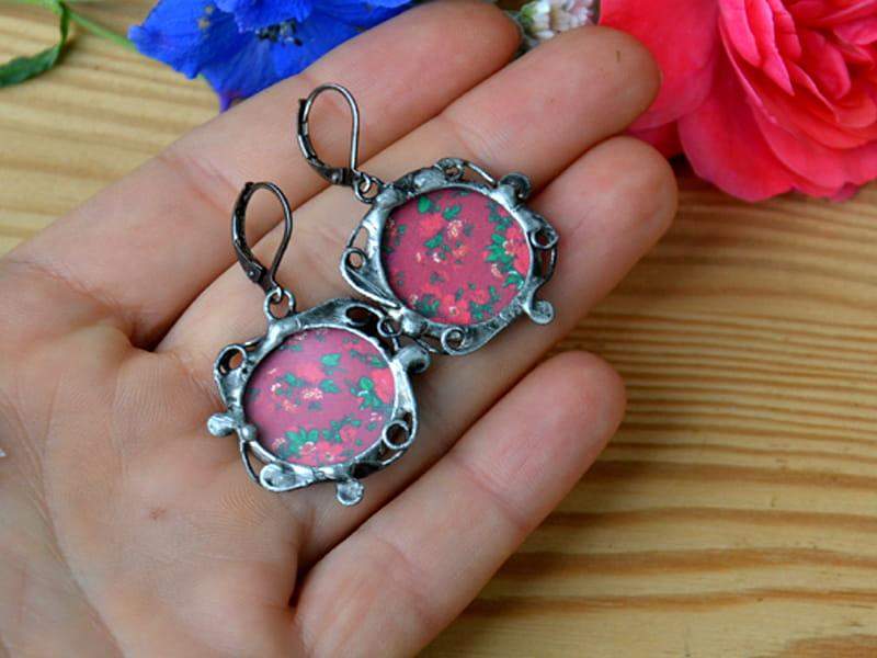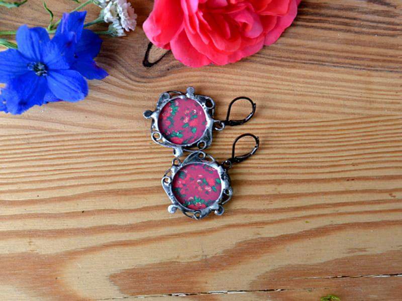 Unikatowe kolczyki z motywem góralskim. Rustykalna, ozdobna oprawa wykonana z miedzi pokrytej ekologiczną cyną w kolorze starego srebra. Długość kolczyka to ok. 4 cm. Biżuteria w 100% wykonana ręcznie, poszczególne sztuki mogą się minimalnie różnić.