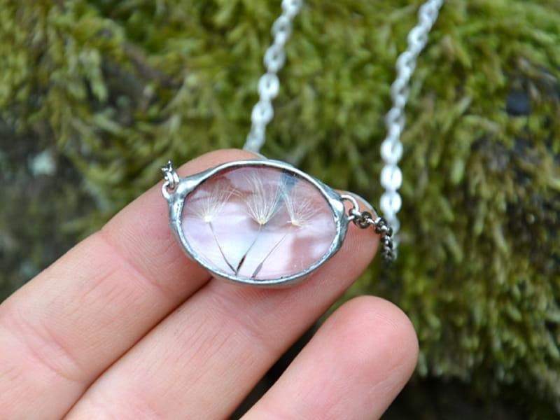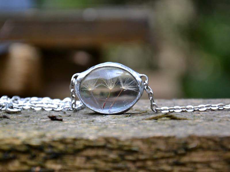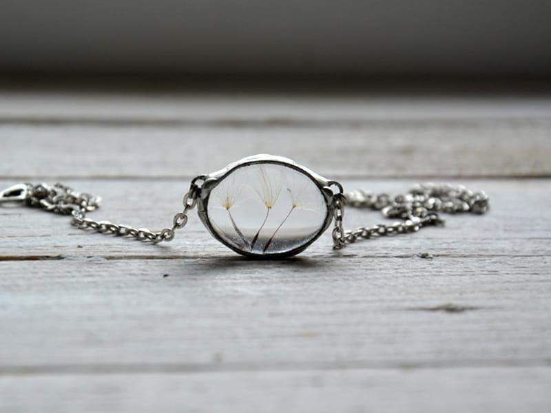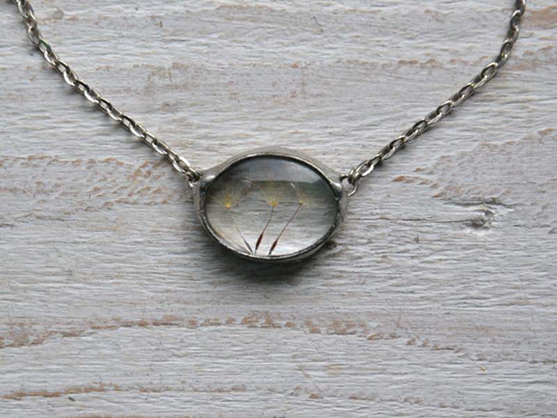 Subtelny naszyjnik z nasionami dmuchawca zamkniętymi w szkle.