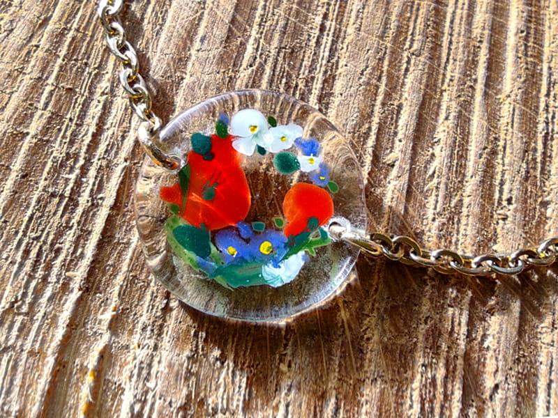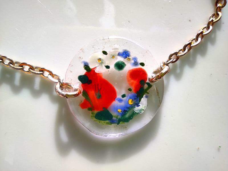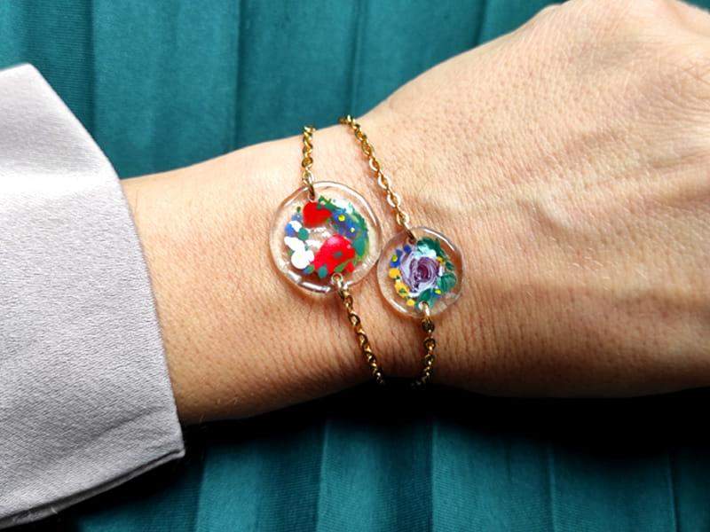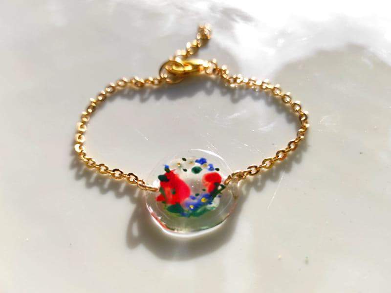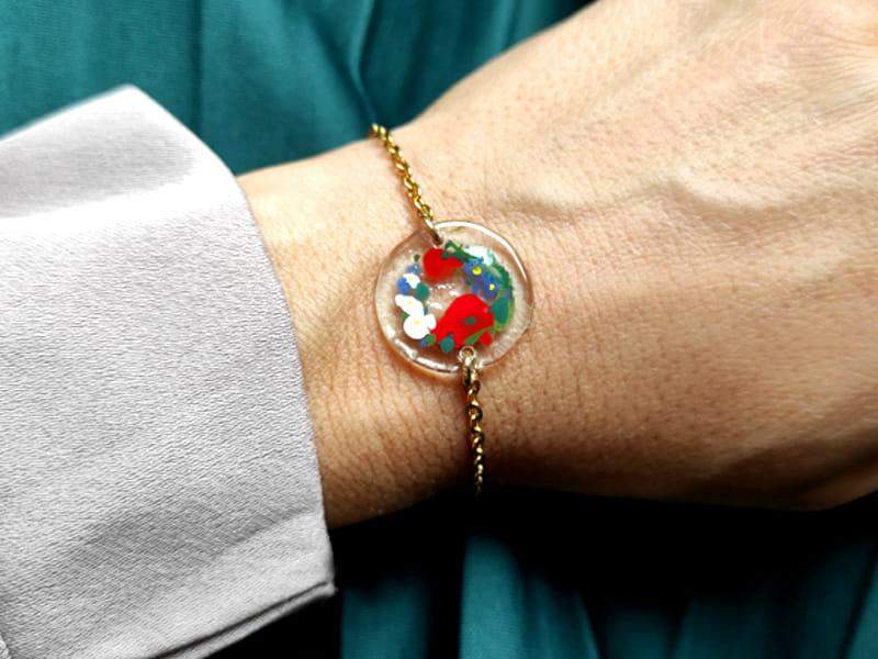 Artystyczna bransoletka z namalowanym wiankiem niezapominajek Szkiełko zostało ręcznie przycięte, pomalowane i wypalone w bardzo wysokiej temperaturze, dzięki czemu malunek jest trwały, a brzegi szkła gładkie i zaokrąglone.