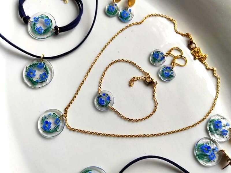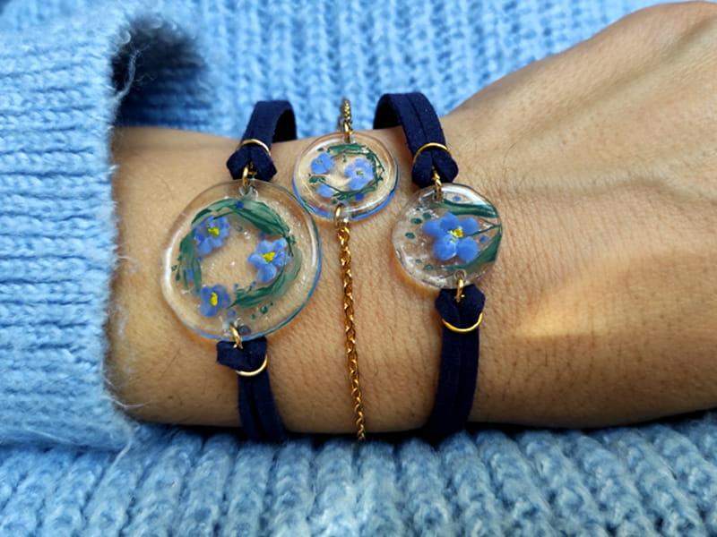 5. Malowana bransoletka z wiankiem niezapominajek (wykończenia ze stali chirurgicznej w kolorze złotym)