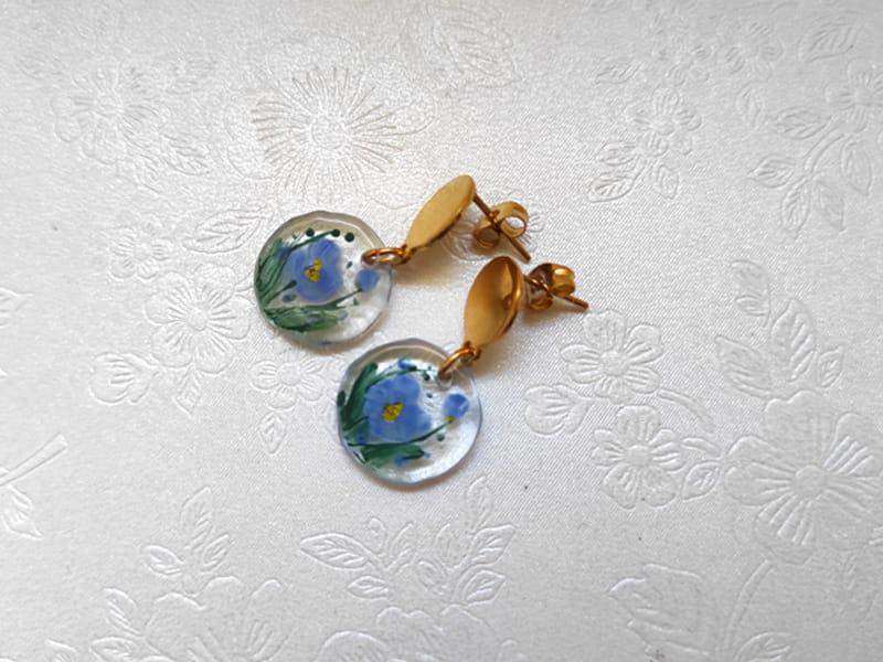Artystyczne kolczyki z namalowanymi niezapominajkami Szkiełka zostały ręcznie przycięte, pomalowane i wypalone w bardzo wysokiej temperaturze, dzięki czemu malunek jest trwały, a brzegi szkła gładkie i zaokrąglone.