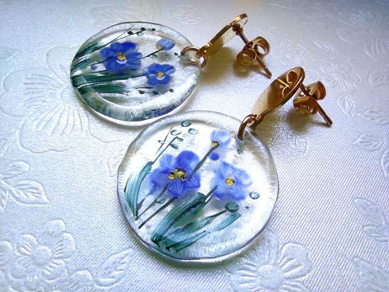 Artystyczne kolczyki z namalowanym wiankiem niezapominajek Szkiełka zostały ręcznie przycięte, pomalowane i wypalone w bardzo wysokiej temperaturze, dzięki czemu malunek jest trwały, a brzegi szkła gładkie i zaokrąglone.