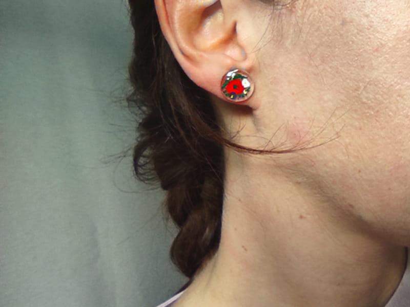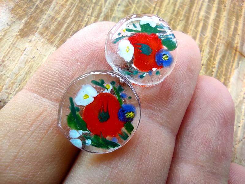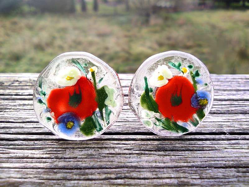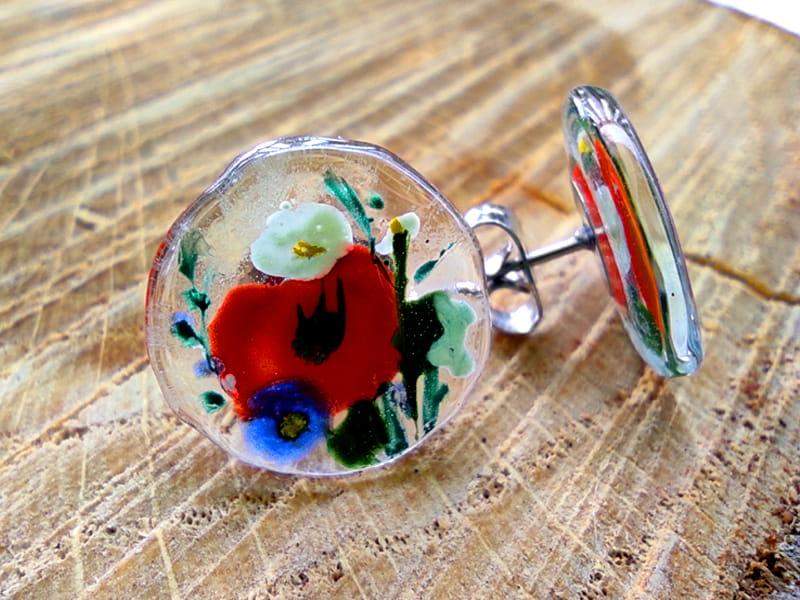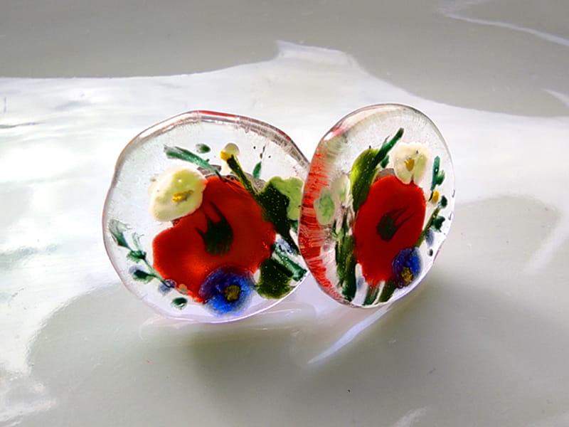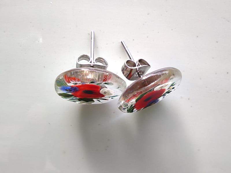 Urocze kolczyki ze szkiełkami z namalowanymi makami i polnymi kwiatami Szkiełka zostały ręcznie wycięte, pomalowane i wypalone w bardzo wysokiej temperaturze, dzięki czemu malunek jest trwały, a brzegi szkła gładkie i zaokrąglone.