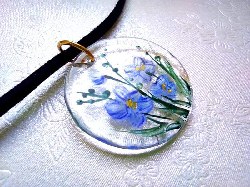 Artystyczny naszyjnik z namalowanymi na szkle niezapominajkami Szkiełko zostało ręcznie przycięte, pomalowane i wypalone w bardzo wysokiej temperaturze, dzięki czemu malunek jest trwały, a brzegi szkła gładkie i zaokrąglone.