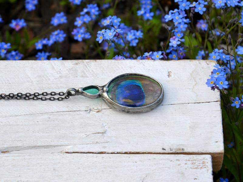 Niepowtarzalny naszyjnik z pawim piórem zamkniętym w szkle i szklaną zieloną kropelką. Długość wisiora to ok 6 cm. Oprawa i łańcuszek o długości 80 cm w kolorze starego srebra. Biżuteria w 100% wykonana ręcznie, więc poszczególne egzemplarze mogą nieznacznie się między sobą różnić