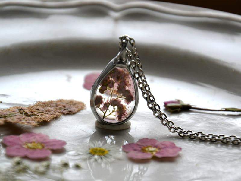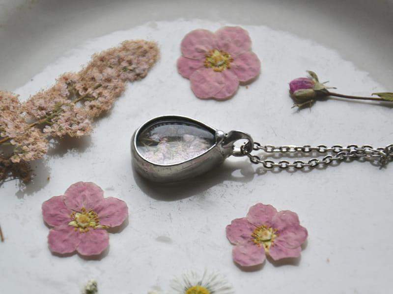 Uroczy naszyjnik z zamkniętym w szkle różowym kwiatuszkiem.